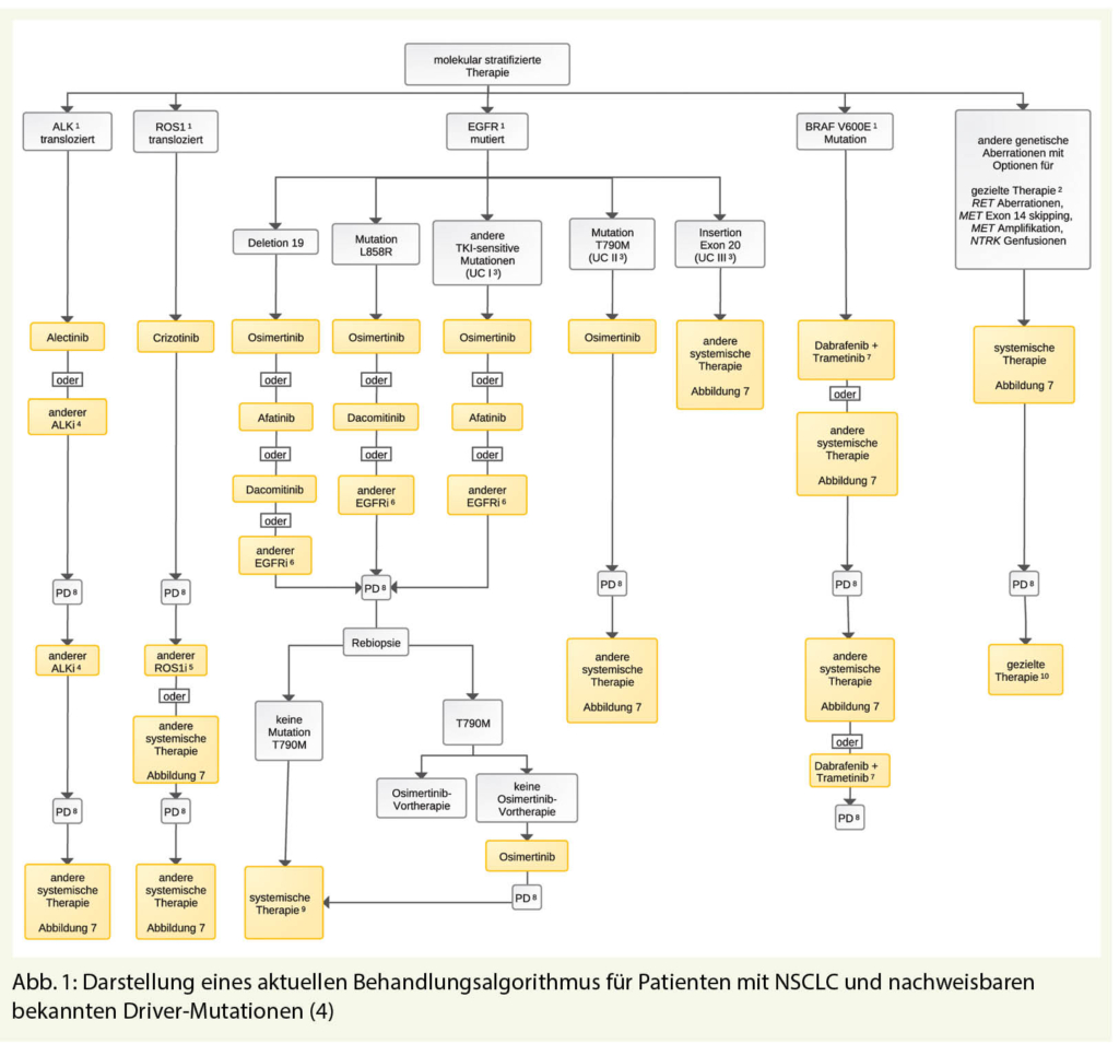 Als Beispiel wie heute die personalisierte Onkologie praktiziert wird sei hier das Nichtkleinzellige Lungenkarzinom NSCLC angeführt. Hatten wir noch vor 20 Jahren im Wesentlichen die Nichtkleinzelligen Lungenkarzinome unterschieden in die Plattenepithel- und Adeno-Karzinome so unterschieden wir heute circa 20 molekulargenetisch verschiedene Typen und diese Zahl nimmt laufend zu. Ein aktueller Behandlungsalgorithmus für Patienten mit NSCLC und nachweisbaren bekannten Driver-Mutationen ist in Abbildung 1 (4) dargestellt.