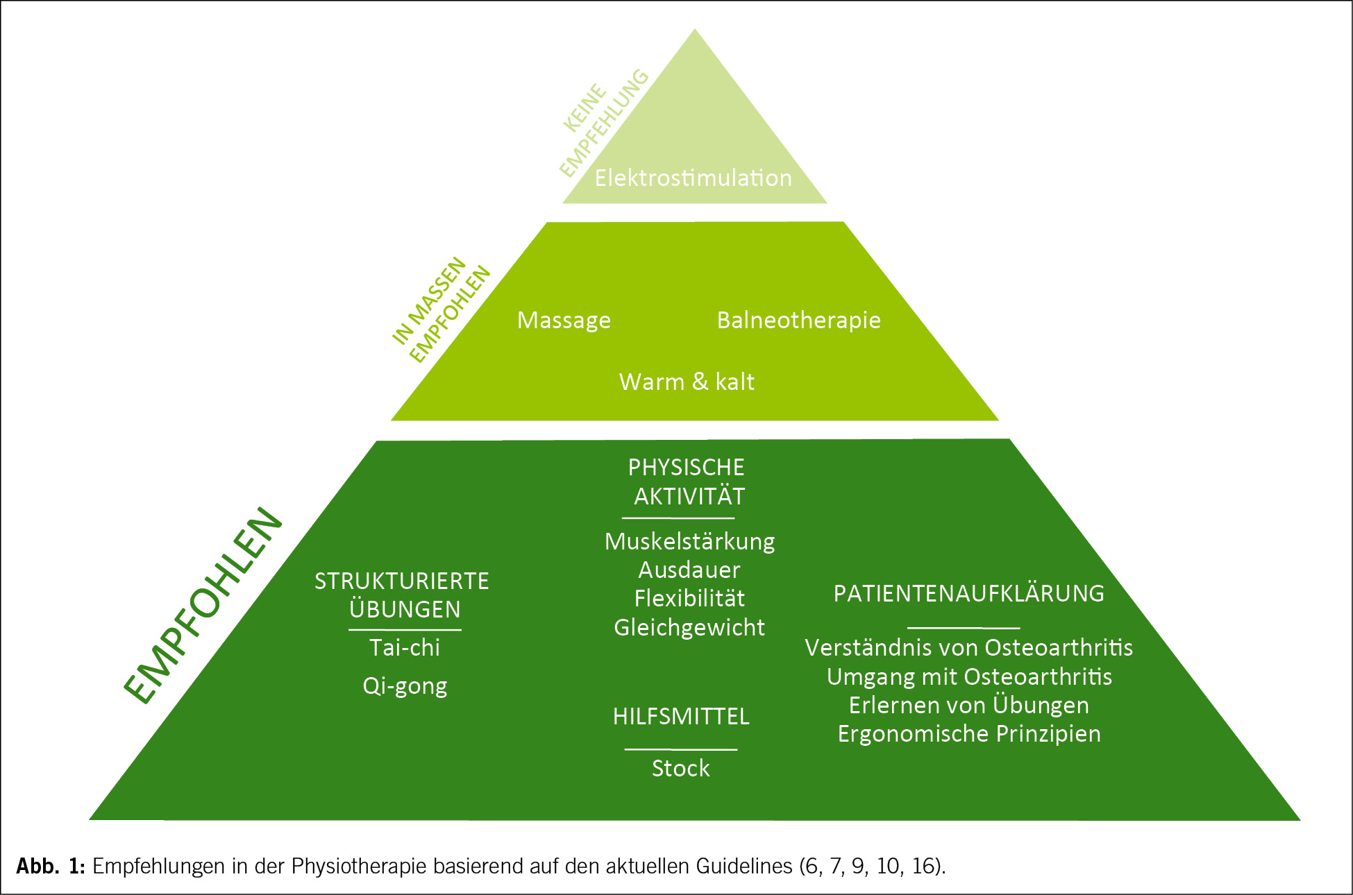Der Physiotherapeut muss den Patienten bei der Durchführung der physikalischen Therapie darauf hinweisen, dass er nicht über seine Schmerzgrenze hinaus trainiert. Eine umfassende Eingangsuntersuchung ermöglicht es dem Therapeuten, ein sinnvolles und wirksames Programm zu entwickeln (5). Im Folgenden werden sehr empfehlenswerte, mässig wirksame und nicht empfehlenswerte Interventionen unterschieden (Abb. 1). Diese Einteilung basiert auf den Ergebnissen klinischer Studien und dem wissenschaftlichen Fortschritt in der Arthrosetherapie.