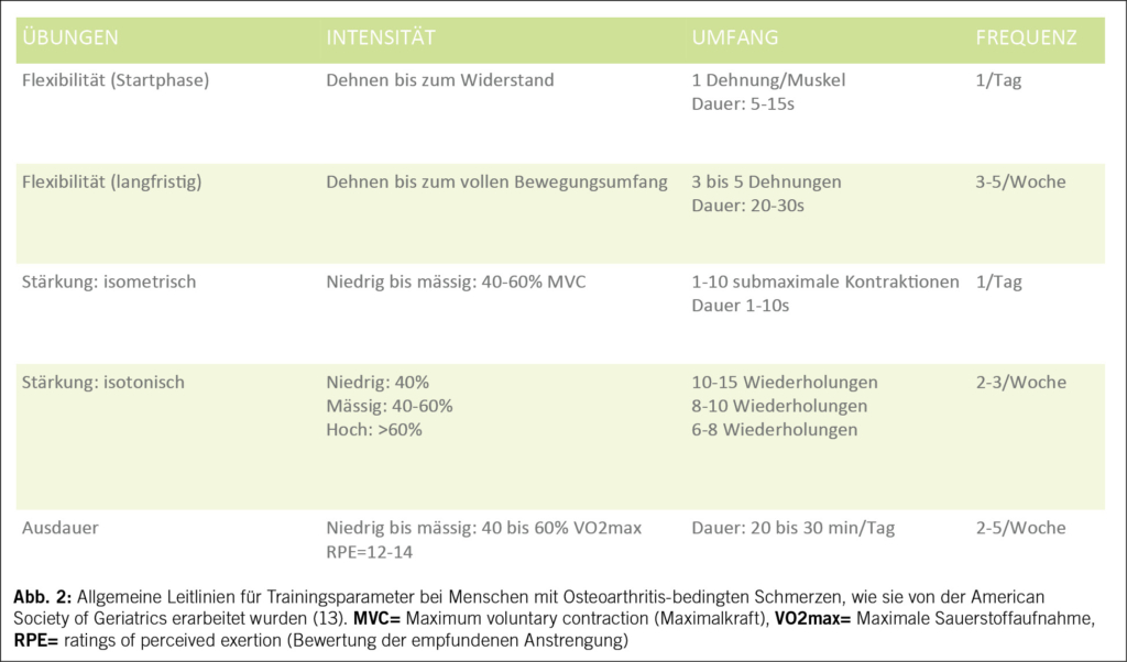 Bewegung im Allgemeinen hat sich als wirksam bei der Schmerzbekämpfung erwiesen (10). Neben der Wirkung auf den Schmerz selbst könnten verschiedene Wirkungsmechanismen vorliegen, wie z.B. die Verbesserung der allgemeinen Funktion, des Selbstbewusstseins, die Verringerung von Depressionen und Angstzuständen (11), die Steigerung der sozialen Interaktion, die Verbesserung der Körperzusammensetzung oder die Verbesserung der Erholung von Knorpelschäden (12). Zu den wichtigsten Komponenten eines jeden Bewegungsprogramms gehören Übungen zur Verbesserung der Beweglichkeit, Kraft und Ausdauer. Abbildung 2 zeigt die grundlegenden Empfehlungen der American Society of Geriatry (13).