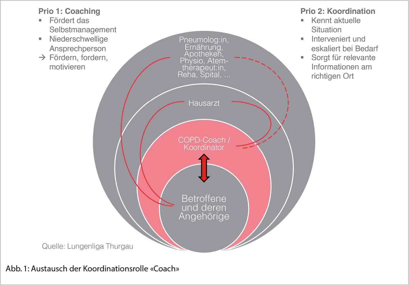 Ein einfaches interprofessionelles Zusammenspiel zwischen Hausarzt, Coach, Lungenliga, Pneumolog/innen, Spitälern und andern Leistungserbringern ist gewährleistet. Eine strukturierte Checkliste für COPD-Patienten/innen vereinfacht die regelmässigen Untersuchungen. Hausärzte können sich auf die Kerngespräche (Initialgespräch, Check-ups) fokussieren. Eine Entschädigung für die Hausärztinnen erfolgt im Rahmen von Managed-Care Verträgen. Bei der Behandlung und Therapie von COPD-Patienten/innen kommt es zu weniger Doppelspurigkeit.