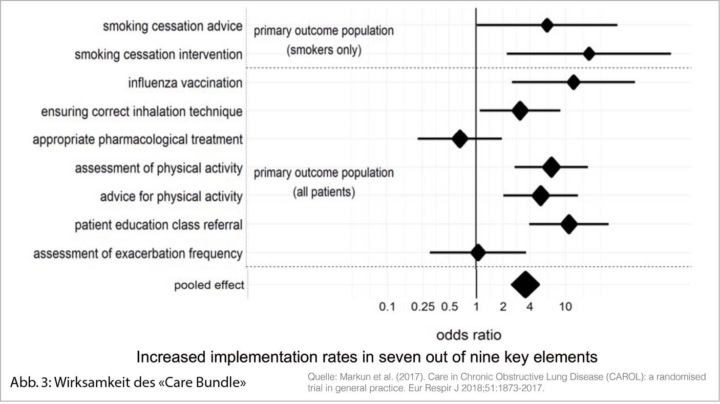 Arztbesuche werden anhand des «Care Bundles» strukturiert. Patienten/innen werden von einem «COPD-Coach» unterstützt, welcher sicherstellt, dass diese bei Bedarf einen Termin bei ihrem Behandlungsteam wahrnehmen. Ein verbessertes Selbstmanagement und Gefühl für die Erkrankung durch das Programm «Besser leben mit COPD» soll die Reduktion der Hospitalisationen infolge von Exazerbationen vermindern und somit die Kosten fürs Gesamtsystem reduzieren. In einem Pilotprojekt im Kanton Thurgau sollen alle Elemente zur Anwendung kommen und die Verbesserung der Situation für Betroffene aufzeigen.