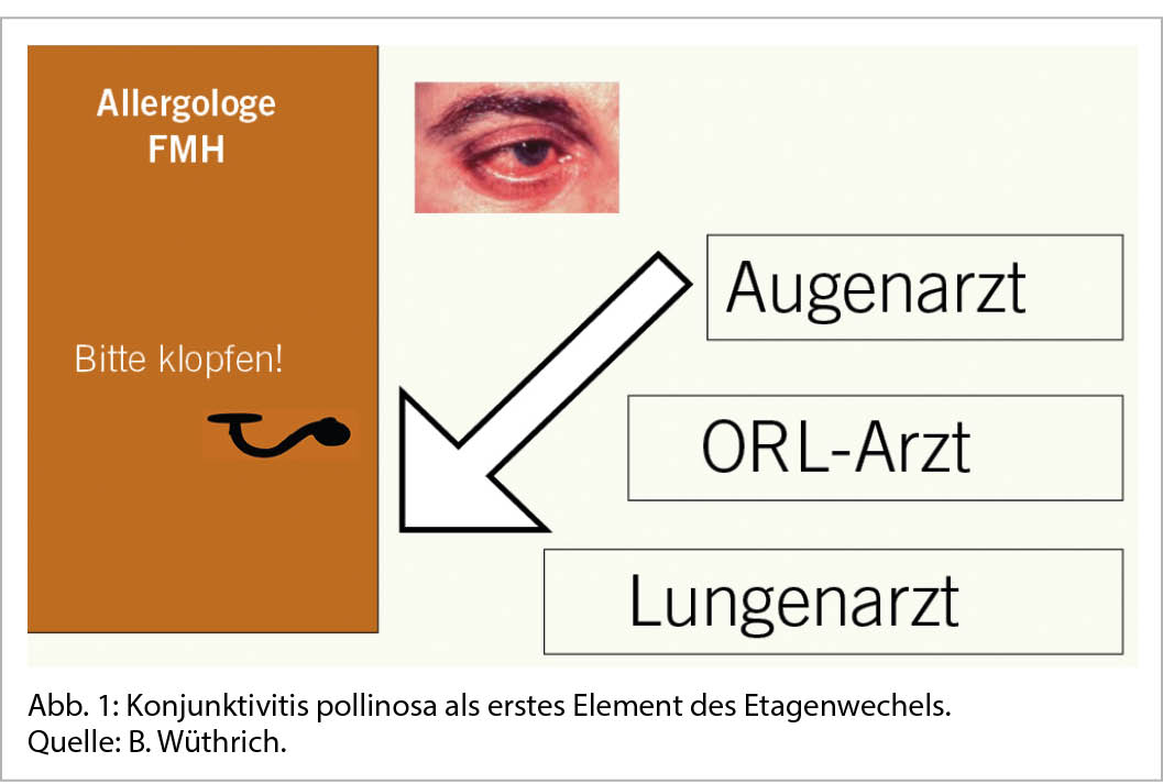 Die therapeutische Strategie muss einerseits auf die Verbesserung der Lebensqualität des Patienten und die Möglichkeit der Prävention einer pollenabhängigen Symptomatik ausgerichtet sein, mit dem Ziel, den spezifischen Allergenkontakt oder etwaige unspezifische Reizfaktoren möglichst vermeiden zu können, andererseits muss sie sich auf eine adäquate medikamentöse Behandlung oder gegebenenfalls eine allergen-spezifische Immuntherapie stützen. Im Vordergrund der medikamentösen Therapie steht die Bekämpfung der allergischen Entzündung, um die mögliche Entwicklung von Komplikationen zu verhindern, d.h. Risiko für Rhinosinusitis oder Otitis oder Etagenwechsel mit Befall der unteren Atemwege (14). Die rezidivierende, zunächst isolierte pollenabhängige Konjunktivitis ist häufig das erste Warnzeichen eines Etagenwechsels, weshalb eine allergologische Abklärung schon in dieser Phase indiziert ist (Abb. 1)