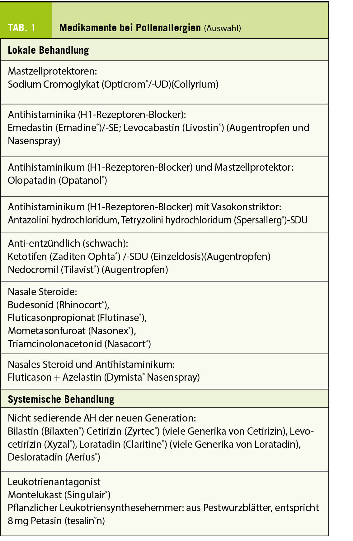 Chromone hemmen die Mastzellfreisetzung von Histamin und anderen Mediatoren und werden als Mastzellstabilisatoren bezeichnet. Es gibt reine Präparate in Tropfenform oder in Kombination mit Antihistaminika-H1 (Tab. 1). Sie sind weniger wirksam als Antihistaminika und typische Steroide und haben eine durchschnittliche Wirkung von 2 bis max 4 Stunden, wobei sie eine höhere tägliche Verabreichung erfordern. Antileukotriene (z.B. Singulair®: Montelukast) haben sich bei der Behandlung von Asthma und allergischer Rhinitis als besonders wirksam erwiesen. Wenn sie in Kombination mit Antihistaminika der zweiten Generation angewendet werden, kann das klinische Ergebnis bei Rhinitis in den ersten 24 Stunden verbessert werden (17). Als weitere Therapieansätze kommen Präparate mit Pestwurzblättern (Tesalin®) in Frage, die antiallergisch und antiinflammatorisch wirken. Zu Therapiealternativen gehören Bioresonanz, Homöopathie und Akupunktur, die zwar subjektiv teilweise positive Aspekte zeigen, aber wegen fehlender wissenschaftlicher Studien keine weltweite Akzeptanz haben.