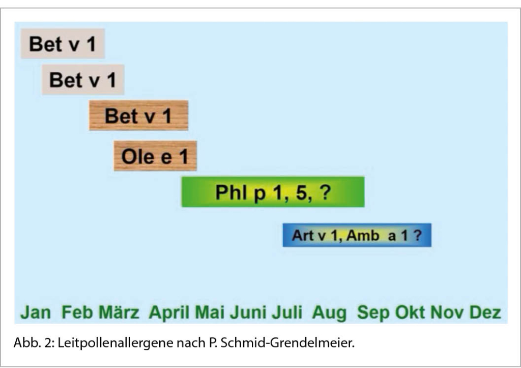 Der Einsatz von rekombinanten Pollenallergenen in der Diagnostik hat bei der ASIT bessere Therapieerfolge ermöglicht. Tatsächlich hat sich bei Patienten mit einer Sensibilisierung für Majorallergene wie Bet v 1 bei Birken oder r Phl p 1, rPhl p 5 bei Gräsern die spezifische Immuntherapie als sehr wirksam erwiesen (Abb. 2 – siehe auch Tab. 1 und Tab. 2 im ersten Teil dieser Arbeit in «der informierte arzt» 02/22, S. 22). Auch die Modalität der Durchführung der ASIT, ob subkutan oder sublingual, sollte sorgfältig abgewogen werden, da die Kosten der Pollenpräparate in Tabletten-Form höher sind. Bei einer 3-jährigen perennialen Behandlung betragen die Gesamtkosten 5303 Franken bei der SLIT (sublinguale Immuntherapie) und 4077 Franken bei der SCIT (subkutane Immuntherapie) (20). Die ASIT sollte in der allergenfreien Saison begonnen werden.