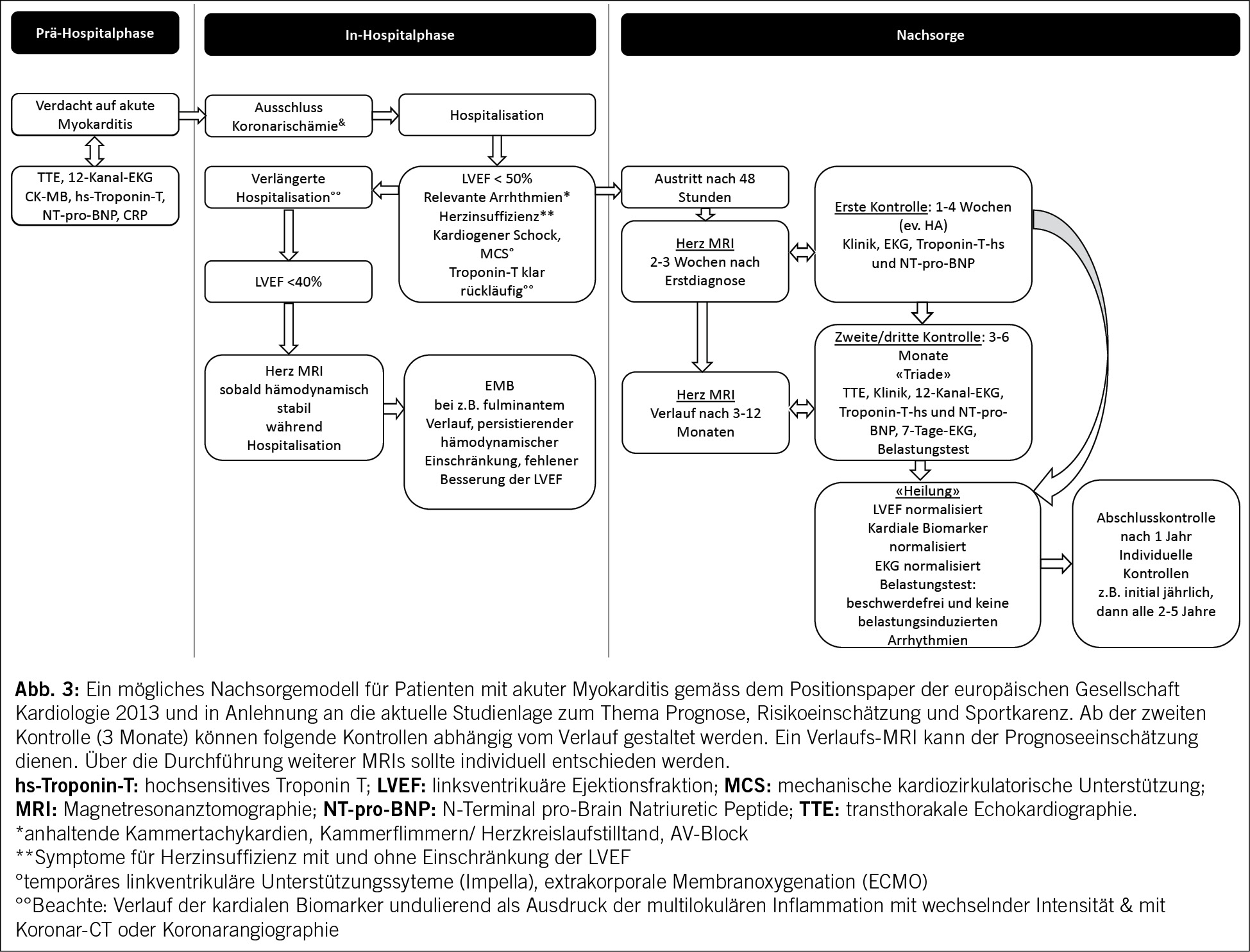 Die Zweite Kontrolle erfolgt in der Regel nach 3 Monaten mit einem sogenannten «Triade Test», der 3 Untersuchungsmodalitäten umfasst: 12-Kanal-EKG, TTE, Troponinbestimmung. Die Rückkehr zur sportlichen Aktivität gilt als sicher, wenn zusätzlich keine relevanten Arrhythmien (anhaltende Kammertachykardien, AV-Block) in der 24 Stunden Rhythmusüberwachung und im kardialen Belastungstest vorkommen (15–17). Sofern ein Kriterium des Triade Tests pathologisch ausfällt oder Arrhythmien in einer Untersuchung nachgewiesen werden, gilt die Myokarditis als persistierend und weitere Verlaufskontrollen müssen folgen, z.B. nach weiteren 3 Monaten. Eine Erweiterung der diagnostischen und Aenderung der therapeutischen Strategie ist dann notwendig. In der Regel ist ein erneutes kardiales MRI und die Evaluation einer EMB zu empfehlen. Ein Sonderfall stellt die isolierte Erhöhung des Troponin-T dar. Differentialdiagnostisch muss an das Vorliegen heterophiler Antikörper, die mit dem Labor-Essay interferieren gedacht werden und die Bestimmung des ausschliesslich kardial exprimierten Troponin-I kann klären, ob es sich um einen laboranalytischen Fehler oder eine persistierende Inflammation handelt. Auch chronische Pathologien der Skelettmuskulatur führen zu einer Erhöhung des Troponin-T und müssen insbesondere in Hinblick auf systemische inflammatorische Erkrankungen mit myokardialer Beteiligung an dieser Stelle differenziert werden.