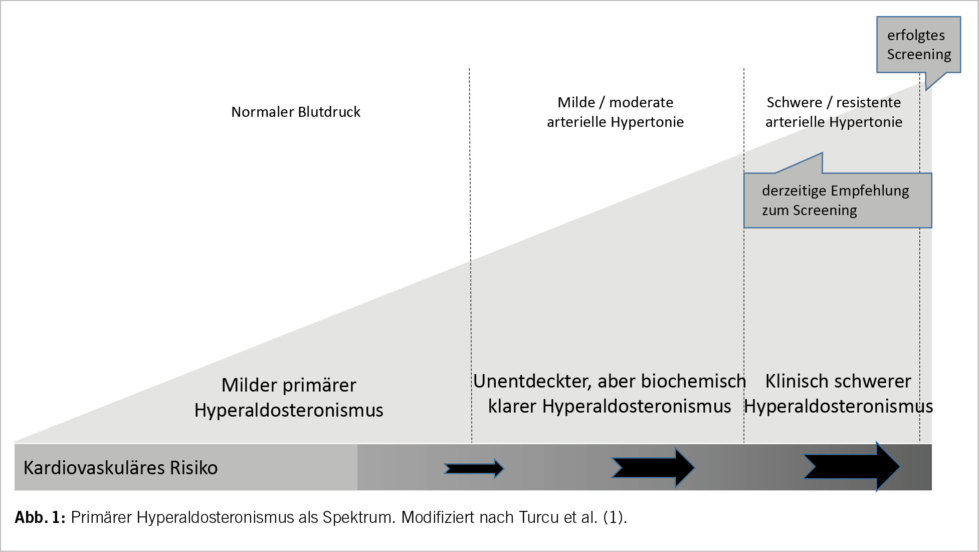 Ein Aldosteron-Exzess – unabhängig von Renin und nicht reguliert durch Volumen- und Salzhaushalt – führt in letzter Konsequenz zu arterieller Hypertonie und Hypokaliämie. Im frühen Stadium einer solchen Dysregulation kann allerdings die Volumenexpansion kompensiert werden. Primärer Hyperaldosteronismus ist in dem Sinn ein Kontinuum, das von nicht-supprimierbarem Aldosteron und normalem Blutdruck über sog. «low renin hypertension» mit milder Hypertonie und normalem Kalium bis zu schwerer / resistenter Hypertonie und Hypokaliämie reicht. Parallel dazu steigt das Risiko für kardiovaskuläre Erkrankungen, Herz- und Niereninsuffizienz (Abb. 1).