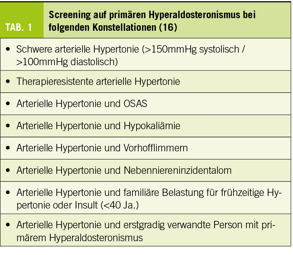 Trotz der relativ hohen Prävalenz und vermeidbaren Folgen bei rechtzeitiger Diagnose und Behandlung wird der primäre Hyperaldosteronismus weiterhin selten gesucht und spät erkannt (14). Vor diesem Hintergrund wird die Diskussion über das Screening geführt. In praktisch allen akzeptierten Guidelines wird eine Abklärung bei schwerer oder resistenter Hypertonie empfohlen mit zusätzlichen Faktoren wie Hypokaliämie oder OSAS (Tab. 1). De facto findet ein Screening am häufigsten im Kontext eines Nebenniereninzidentaloms statt (mit entsprechend geringer Ausbeute). Ein universelles Screening aller Personen mit arterieller Hypertonie, wie von verschiedenen Experten immer wieder propagiert, würde eine grosse logistische Herausforderung bedeuten, die unser Gesundheitssystem in der Schweiz wohl nicht leisten könnte. Noch eher denkbar wäre ein Screening jeweils bei Neudiagnose einer Hypertonie, zumal dann noch ohne Medikation die Interpretation der Laborwerte deutlich einfacher ist. Das Problem von Grenzbefunden bei nicht allgemein akzeptierten Diagnosekriterien und komplexer Abklärung bliebe freilich auch dann.