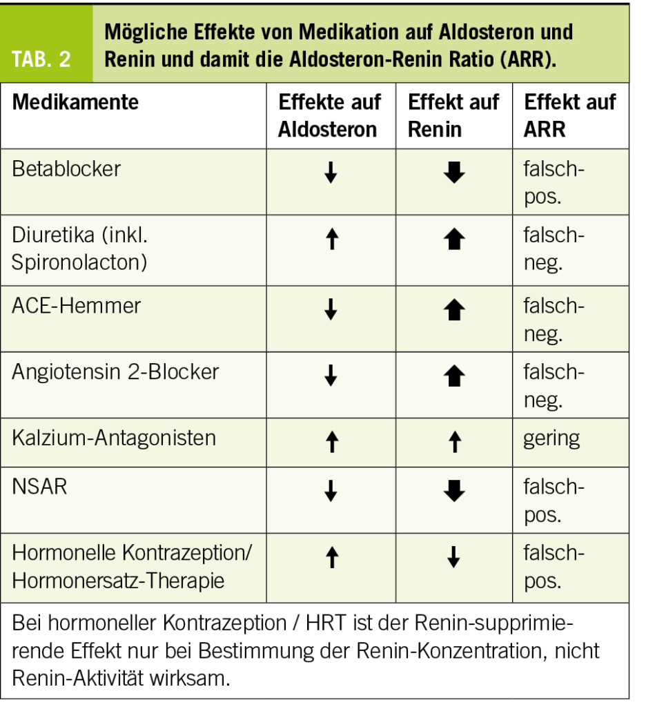 Als Standardtest zum Screening ist die Bestimmung der Aldosteron-Renin-Ratio (ARR) etabliert (15, 16). Die Beeinflussung beider Hormone und damit der Ratio durch zahlreiche Faktoren ist erheblich. Dazu gehören analytische Aspekte (immunologische vs. spektrometrische Messung, Bestimmung von Renin-Aktivität vs. -Konzentration), v.a. aber präanalytische Faktoren. In erster Linie sind das Medikamente, die Renin bzw. Aldosteron verändern (Tab. 2). Die Ratio kann in solchen Fällen falsch-positiv oder falsch-negativ ausfallen. Ideal ist die Umstellung der antihypertensiven Medikation auf solche, die die ARR vergleichsweise wenig tangieren (Kalzium-Antagonisten, Doxazosin, Moxonidin), nicht immer ist dies praktikabel. Allerdings können gelegentlich nach einer solchen Umstellung bessere Blutdruckwerte beobachtet werden als befürchtet, da die Adhärenz zur vorherigen Therapie sicher teilweise nicht optimal war. Konkret sollen wenn immer möglich zumindest Betablocker und Diuretika zwei Wochen pausiert sein, Spironolacton sogar vier Wochen, bevor eine Messung der ARR erfolgt. Da auch Tageszeit und Position eine Rolle spielen, ist eine Bestimmung am Morgen und in sitzender Position empfohlen. Wegen dennoch grosser intraindividueller Schwankungen sollte mindestens zweimal gemessen werden, bevor ein primärer Hyperaldosteronismus weiter abgeklärt oder ausgeschlossen wird (17).