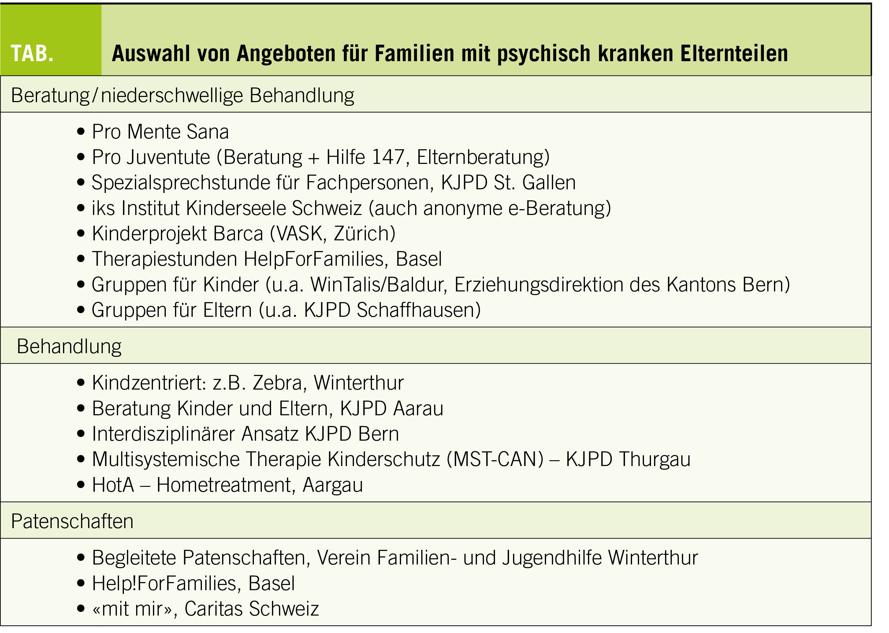 2. Hefti S, Kölch M, Di Gallo A, Stierli R, Roth B, Schmid M. Welche Faktoren beeinflussen ob psychisch belastete Kinder mit einem psychisch kranken Elternteil