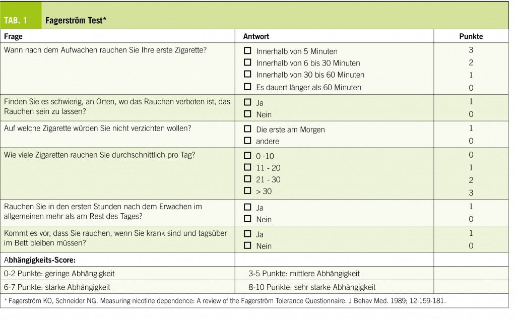Das Rauchen ist eine Sucht / Abhängigkeit und darf auch als solche in der Beratung laut Tarmed abgerechnet werden (Diagnose F17.2 nach ICD 10). Als sehr praktisch hat sich der Fagerström-Test erwiesen (Tab. 1.) (1).