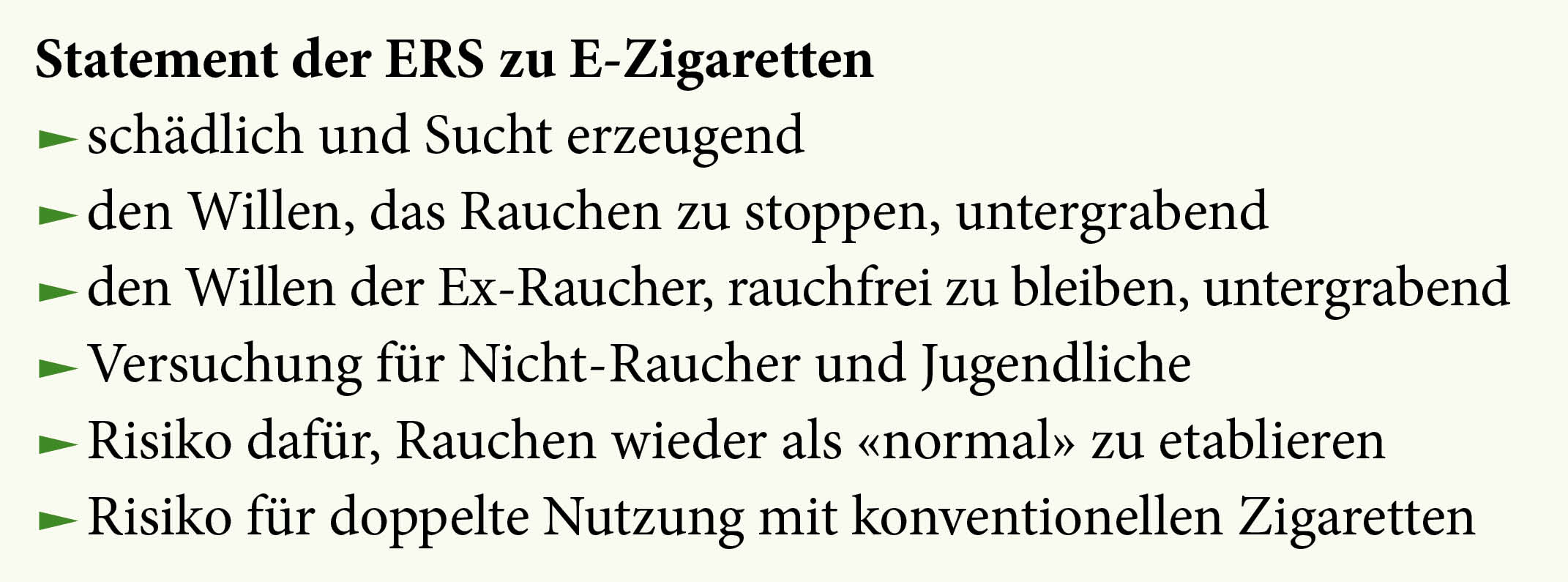 Zuletzt ein Wort zu den E-Zigaretten (mit oder ohne Nikotin) und «heat but not burn»-Tabakprodukten. Diese Produkte werden als harmlos und nicht bedenklich von den Produzenten und bzw. von der Tabakindustrie gepriesen. Im frischen Statement paper der ERS (European Respiratory Society) werden die wichtigsten Mitteilungen so zusammengefasst (4, 5):