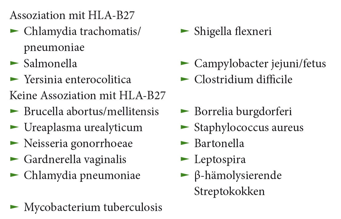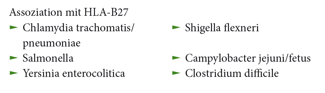 Asymmetrische, nicht infektiöse Oligoarthritis und Systemmanifestation nach klinisch und/oder mikrobiologisch dokumentierter intestinaler oder urogenitaler Infektion. Vorausgehende Infektion ist oft nicht fassbar.