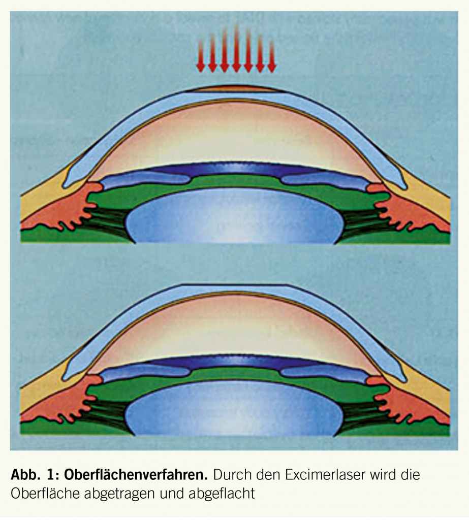 Die Oberflächentechnik hat den Nachteil, dass nach der Operation für 2-3 Tage leichte bis mittelstarke Schmerzen auftreten können, danach ist das Epithel zugewachsen und der Patient schmerzfrei. Der Visusanstieg ist langsamer und erreicht üblicherweise nach 1 Woche zirka 80% vom Maximum. In der Zeit nach der Lasertherapie muss noch für 1-2 Monate mit Antibiotika-Steroid-Tropfen behandelt werden, um eine möglichst reibungslose Heilung zu garantieren. Nach 1 Monat ist das Resultat bereits ziemlich stabil und die Korrektur ändert sich nicht mehr wesentlich. Es können bei dieser Art der Behandlung Hornhauttrübungen auftreten. Mit den richtigen Medikamenten und entsprechender Operationstechnik können störende Trübungen aber in den meisten Fällen verhindert werden.