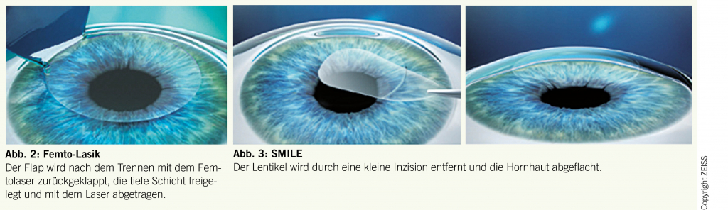 Eine neuere Behandlung ist SMILE (Small Incision Lenticule Extraction). Hier wird mit dem Femtolaser im Inneren der Cornea ein Scheibchen ausgeschnitten, welches dann durch einen kleinen «Tunnel» aus dem Gewebe entfernt werden kann. Dies führt zu einer Abflachung der Oberfläche mit gleichem Resultat wie oben beschrieben. Es soll die Vorteile der Lasik und der Oberflächenbehandlung vereinen, ist aber eine neuere Technik bei welcher Langzeiterfahrungen noch fehlen (Abb. 3).