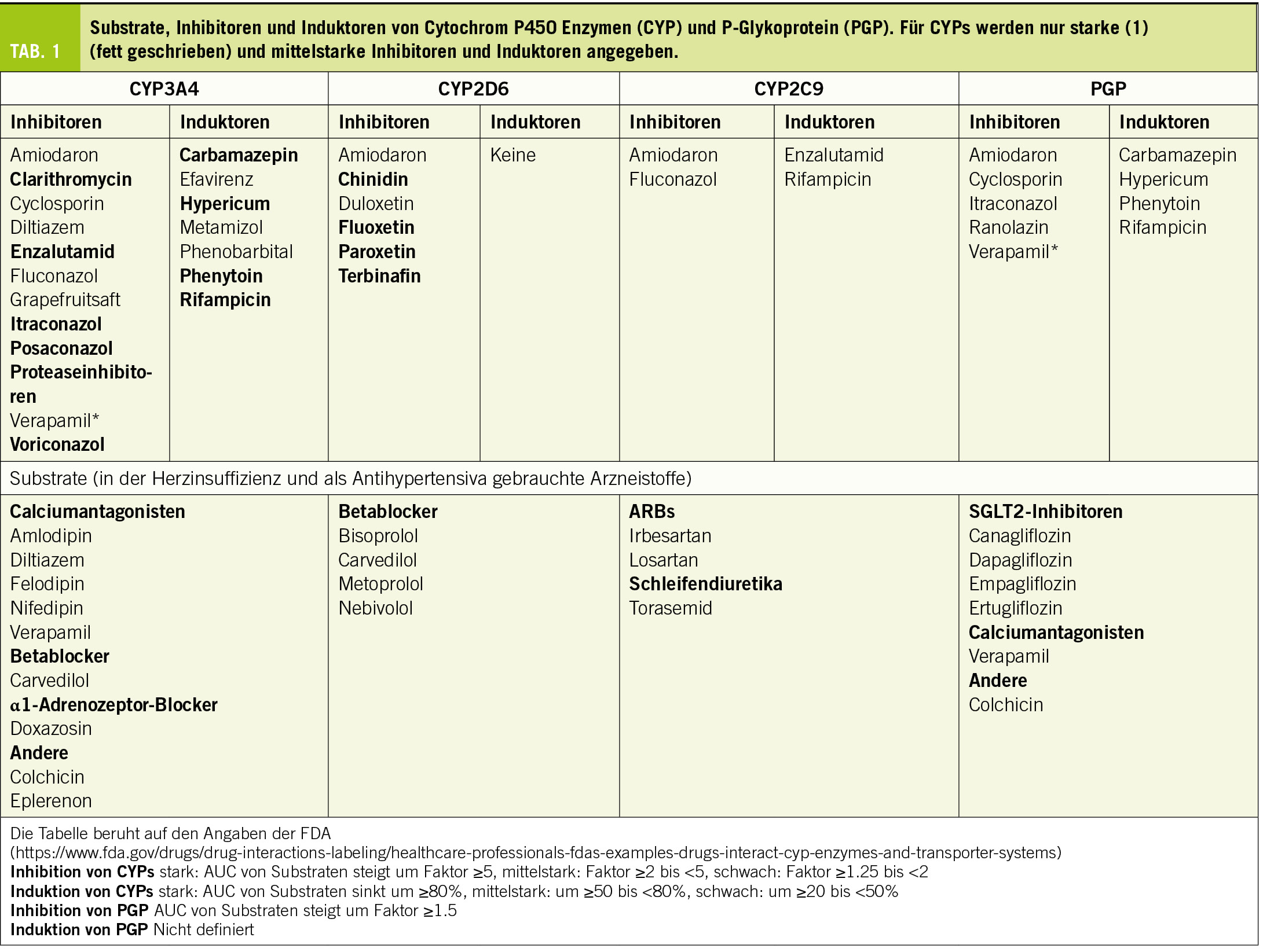 Bezüglich des Mechanismus von Arzneistoffinteraktionen kann grob zwischen pharmakokinetischen und pharmakodynamischen Interaktionen unterschieden werden. Bei den pharmakokinetischen Interaktionen verändert sich die Plasmakonzentration des «Opfers» der Interaktion, währenddem bei pharmakodynamischen Interaktionen eine Kombination von Arzneistoffen mit ähnlichen pharmakodynamischen Eigenschaften (aber unterschiedlichem Wirkmechanismus) vorliegt. Die pharmakokinetischen Interaktionen beruhen meist auf der Hemmung oder Induktion des für den Abbau eines bestimmten Arzneistoffes verantwortlichen Enzyms oder des für den Transport des Arzneistoffes verantwortlichen Proteins. Die wichtigsten für den Arzneistoffmetabolismus verantwortlichen Enzyme, die Cytochrom P450 Enzyme (CYPs) und der wichtigste Arzneistofftransporter, das P-Glykoprotein (PGP) sind in der Tabelle 1 beschrieben. Im Gegensatz zu den pharmakokinetischen sind die pharmakodynamischen Interaktionen in der Kardiologie oft erwünscht, so z.B. bei der Kombination unterschiedlicher Antihypertensiva oder von Statinen mit Ezetimib zur Senkung des LDL-Cholesterins. Ob eine Interaktion klinisch relevant ist oder nicht hängt im Wesentlichen von der unerwünschten Wirkung ab, welche als Folge einer bestimmten Interaktion auftreten kann.