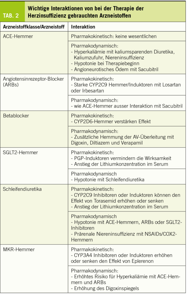 Wichtige Arzneistoffgruppen, welche bei der Therapie von Patienten mit Herzinsuffizienz gebraucht werden, sind ACE-Hemmer, Angiotensinrezeptorblocker (ARBs), Betablocker, SGLT2-Hemmer, Mineralkortikoidrezeptor-Hemmer (MKR-Hemmer) und Schleifendiuretika. Die wichtigsten Interaktionen von Arzneistoffen für die Therapie der Herzinsuffizienz sind in Tabelle 2 gelistet.