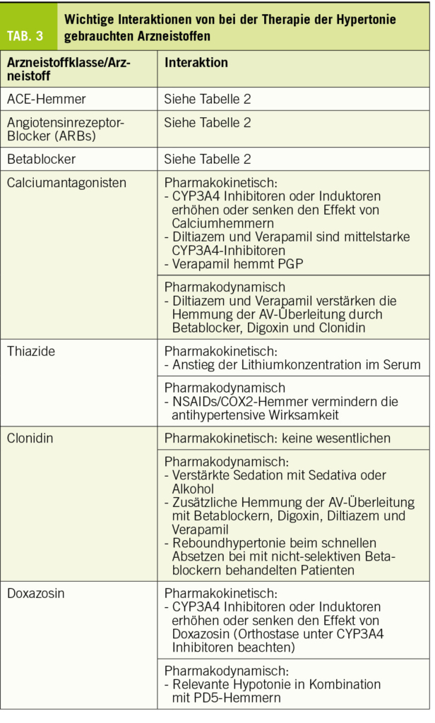 Wichtige Arzneistoffgruppen, welche bei der Therapie von Patienten mit Hypertonie gebraucht werden, sind ACE-Hemmer, Angiotensinrezeptorblocker (ARBs), Calciumantagonisten, Thiazide, Betablocker, Mineralkortikoidrezeptor-Hemmer (MKR-Hemmer), α2-Adrenozeptoren-Agonisten und α1-Adrenozeptoren-Blocker. ACE-Hemmer, ARBs, Betablocker und MKR-Hemmer sind bereits bei der Therapie der Herzinsuffizienz besprochen worden. Die wichtigsten Interaktionen von Arzneistoffen für die Therapie der Hypertonie sind in Tabelle 3 gelistet.
