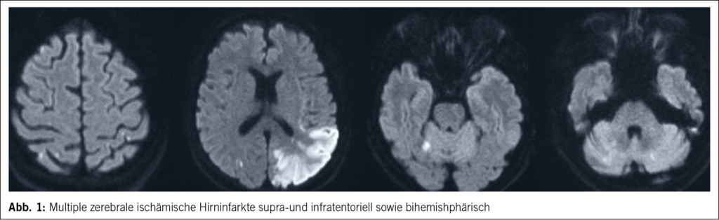 Eine 68-jährige Patientin wurde mit Verdacht auf einen Schlaganfall mit einer schweren Aphasie, einer leichtgradigen motorischen Hemiparese rechts und einer deutlichen Vernachlässigung (Neglekt) der linken Körperseite in ein Zentrumsspital eingeliefert. Einige Monate zuvor war bei der Patientin ein metastasierendes Bronchialkarzinom diagnostiziert worden. Bildgebende Untersuchungen zeigten das Vorliegen multipler zerebraler Infarkte in verschiedenen zerebralen Versorgungsgebieten, was auf eine proximal-embolische Genese schliessen liess (Abb. 1).