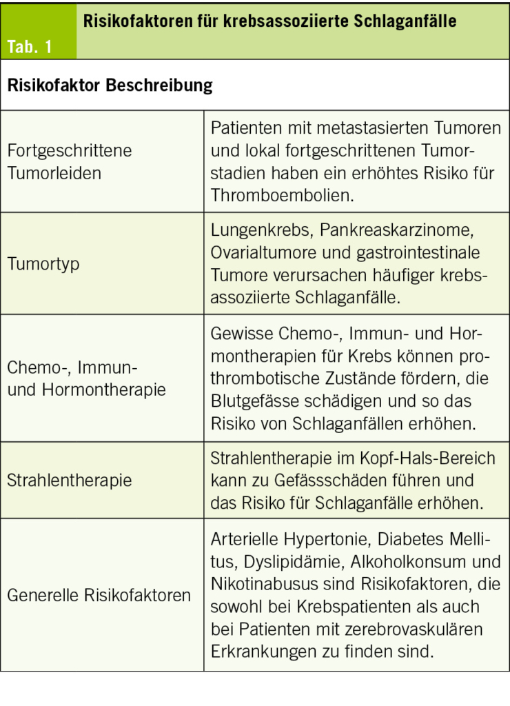 Dabei werden krebsassoziierte Schlaganfälle neben gemeinsamen kardiovaskulären Risikofaktoren auch durch spezifische krebsbedingte Einflüsse verursacht. Besonders Patienten mit fortgeschrittenen oder metastasierten Tumoren weisen ein erhöhtes Schlaganfallrisiko auf. Das Schlaganfallrisiko ist hierbei insbesondere in den ersten Monaten nach der Krebsdiagnose erhöht.