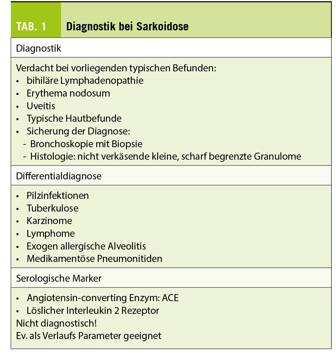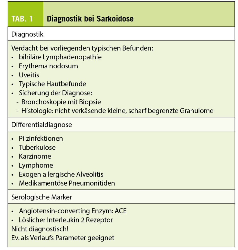 Die Sarkoidose ist eine Multisystem-Erkrankung, die durch nicht-verkäsende Granulome charakterisiert ist. Diese können in allen Organen auftreten, vor allem aber und am häufigsten sind die Lungen, Lymphknoten, die Haut, Augen und die Leber betroffen. Die Ursache ist ungeklärt, wobei ein Verdacht auf inhalative Noxen besteht bei genetischer Prädisposition. Die Prävalenz in der Schweiz beträgt 44/100 000, die Prävalenz hospitalisationsbedürftiger Sarkoidosen 16/100 000. Die durchschnittliche jährliche Inzidenz liegt bei 7/100 000. Hinweise zur Diagnostik, Differentialdiagnose und zu serologischen Markern sind in Tab. 1 zusammengefasst.
