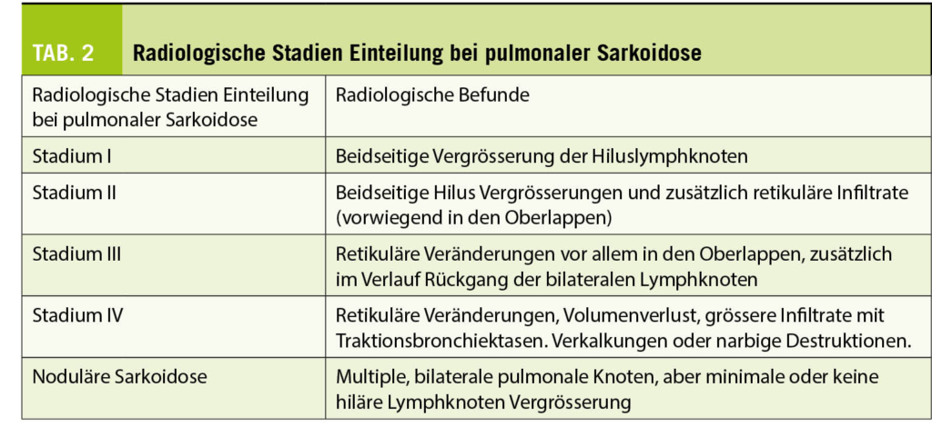 Die meisten Patienten mit pulmonaler Sarkoidose brauchen keine Behandlung, da eine grosse Anzahl asymptomatisch bleibt, nicht progressiv verläuft oder sogar spontan abheilt. Für Patienten mit deutlicher Funktionseinschränkung der Lungen muss aber eine Therapie diskutiert werden, um irreversible pulmonale Organschädigungen wie Lungenfibrose oder sogenanntes Honeycombing zu vermeiden (Zur radiologischen Stadieneinteilung siehe Tab. 2).