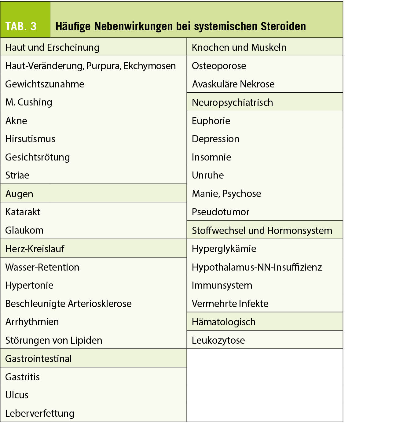 Orale Glucocorticoide werden weltweit am häufigsten eigesetzt, um Sarkoidose-Symptome und eine fortschreitende Lungenerkrankung zu bremsen, dies obwohl durch Steroide die Erkrankung meistens nicht vollständig abheilt. Sie verbessern meistens die Symptome wie chronischen Husten oder Atemnot. Zusätzlich bessern im Verlauf die radiologischen Veränderungen, vor allem zu Beginn. Trotzdem ist der Nachteil das Auftreten von Nebenwirkungen (Tab. 3) und der unsichere Benefit der Therapie im Rahmen einer Langzeitbehandlung. Vor Starten einer Therapie müssen die Patienten genau untersucht werden, vor allem müssen mitbeteiligte Organe erkannt und komorbide Erkrankungen wie Herzinsuffizienz, Thromboembolie, pulmonale Hypertonie, Diabetes mellitus oder eine Tuberkulose, welche initial ähnlich verlaufen kann, differenzialdiagnostisch ausgeschlossen werden. Die Abklärung umfasst eine plethysmographische Lungenfunktion, ein HRCT der Lungen, den Ausschluss einer Tuberkulose mittels bakteriologischer Methoden und Interferon-Gamma-Tests, sowie bei entsprechendem Verdacht eine Echokardiographie zum Ausschluss einer pulmonalen Hypertonie.