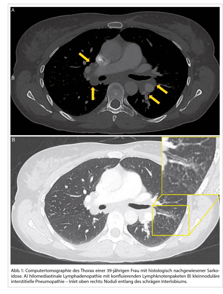 Die Sarkoidose ist eine akut oder chronisch verlaufende entzündliche Multisystemerkrankung unklarer Ätiologie. Bei über 80% der Patienten kommt es zu einer intrathorakalen Manifestation. Die Diagnosestellung basiert auf dem Nachweis von epitheloidzelligen Granulomen, dem Ausschluss anderer Granulomatosen und dem klinischen Erscheinungsbild – kann aber nicht selten herausfordernd sein. Nach einem Screening für einen möglichen Befall weiterer Organe empfiehlt sich eine inter­disziplinäre Festlegung der Therapie und des Nachsorgeschemas. Eine Systemtherapie ist bei symptomatischen Patienten mit relevanten Organmanifestationen bzw. -funktionsstörungen indiziert. Neben Kortikosteroiden stehen weitere immunsup­pressive Medikamente zur Verfügung. Unter anderen haben die TNF-α-Inhibitoren – insbesondere Infliximab oder Adalimumab – eine günstige Wirkung auf die Sardoidose-assoziierte Entzündung und Granulombildung; sie sind aber nicht für diese Indikation zugelassen. Der Krankheitsverlauf ist in den meisten Fällen günstig. Schwere Verläufe sind möglich, insbesondere bei Herz-/ZNS-Befall, pulmonaler Hypertonie, progredienter Fibrosierung der Lunge und/oder komplikativen Aspergillomen. Ein schwer zu beeinflussendes Problem kann auch ein – gelegentlich invalidisierendes – Sarkoidose-assoziiertes Chronic Fatigue Syndrome darstellen.