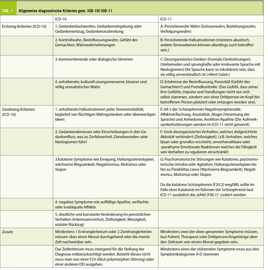 Für die Diagnose einer Schizophrenie sind die diagnostischen Kriterien des ICD-10 (2) bzw. neuerdings des ICD-11 (3) grundlegend. Insgesamt lassen sich die Symptome einer Schizophrenie in eine Positiv- und eine Negativsymptomatik aufteilen. Positivsymptomatik geht häufig einher mit einer Überstimulation, die sich in Wahn oder Halluzinationen äussern kann (1). Die Negativsymptomatik wird durch psychosoziale Unterstimulation wahrscheinlicher und ist durch die in Punkt E des ICD-11s beschriebenen 6As zusammengefasst (Tab. 1).
