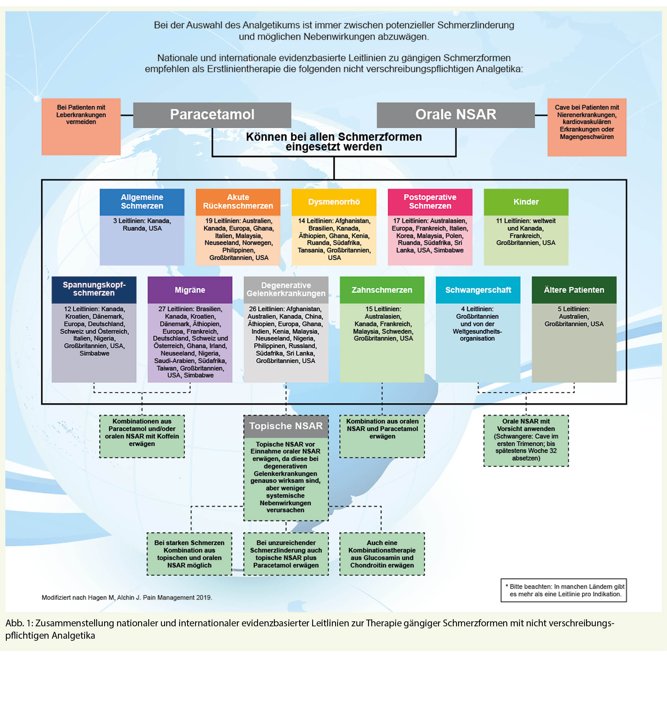 Für die nachfolgende Übersicht wurden Webseiten von medizinischen Fachgesellschaften, Gesundheitsinstitutionen und -organisationen zum Thema Schmerz sowie medizinische Datenbanken (PubMed, ProQuest, Embase, Google und Google Scholar) nach nationalen und internationalen evidenzbasierten klinischen Praxisleitlinien zur Behandlung gängiger Schmerzformen durchsucht. Die Recherche umfasste alle verfügbaren Leitlinien bis April 2019. Berücksichtigt wurden dabei nur aktuelle Versionen von Leitlinien und nur diejenigen, die auf das Thema «nicht-verschreibungspflichtige Analgetika» eingehen. Herangezogen wurden ausschliesslich Leitlinien in englischer Sprache. Insgesamt sind Informationen aus 114 relevanten Leitlinien für erwachsene Schmerzpatienten, vier Leitlinien zum Thema Schmerzen während der Schwangerschaft, 11 Leitlinien zu Schmerzen bei pädiatrischen Patienten und 5 Leitlinien zu Schmerzen bei älteren Patienten in die Übersicht eingeflossen.