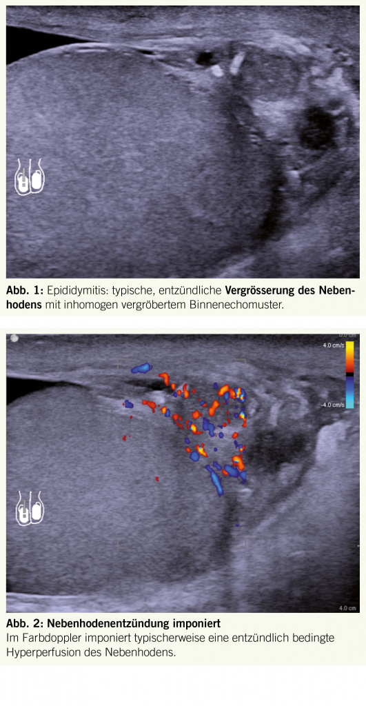 Wegweisend ist bei Verdacht auf eine Nebenhodenentzündung ebenfalls die sonographische Untersuchung des Skrotums. Hierbei imponiert eine echoarme Vergrösserung des Nebenhodens mit inhomogen vergröberten Binnenechomustern (Abb. 1). Im Farbdoppler zeigt sich typischerweise eine «inflammatorische» Hyperperfusion des Nebenhodens (Abb. 2). Oft zeigt sich eine entzündlich bedingte Begleit-Hydrozele. Sonographisch wichtig ist der Ausschluss eines Abszesses, welcher in der Regel einer operativen Sanierung bedarf. Kann ein solcher ausgeschlossen werden, sollte neben einer symptomatischen Therapie mit Bettruhe, Hodenhochlagern und medikamentöser Therapie mit einem Antiphlogistikum, eine primär empirische und später gezielte antibiotische Therapie erfolgen (s.o.).