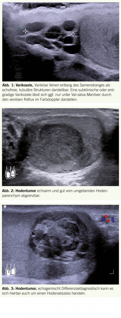Die anschliessend klinische Untersuchung beinhaltet die Palpation des betroffenen und des kontralateralen Hodens, der Brustdrüsen sowie der inguinalen, axillären und supraklavikulären Lymphknotenstationen. Die Sonographie des Hodens, wo Tumore meist als hyperperfundierte, echoarme bis echogemischte irreguläre Läsion im Hodenparenchym imponieren, ist das primäre Diagnostikmittel der Wahl (Abb. 2 und 3).