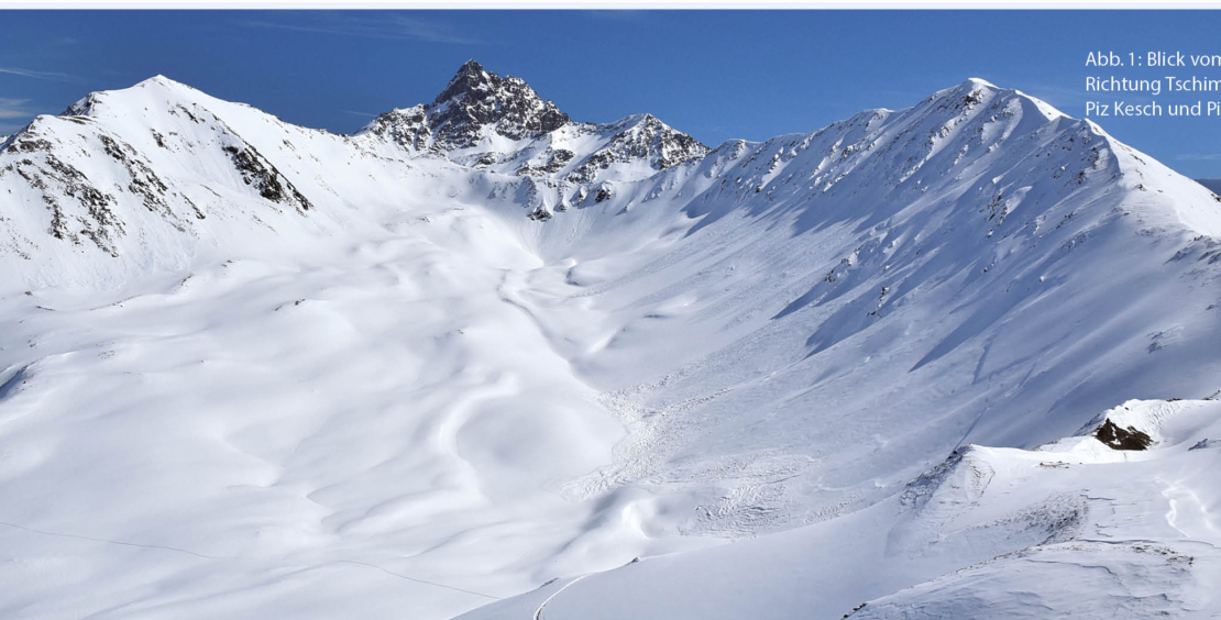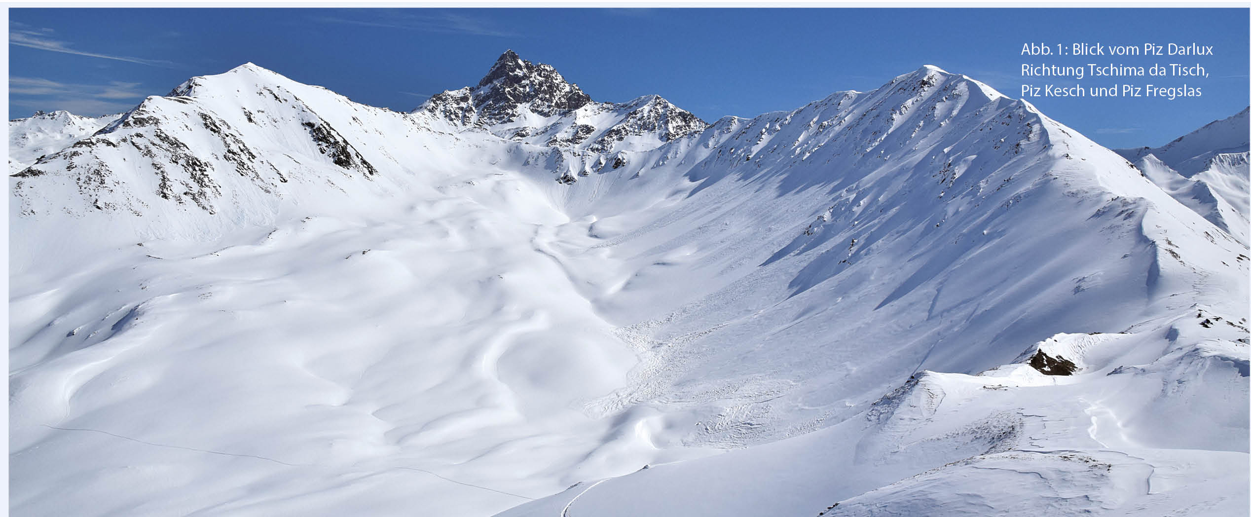 Am zweiten Tag lassen wir uns bei herrlichem Sonnenschein mit der Sesselbahn nach Pros da Darlux und weiter bis zur Alp Darlux hinauftragen. Unsere Rodel haben wir selbstverständlich wieder dabei, lassen diese aber in der Mittelstation für die spätere Talfahrt zurück. In der Schneebar gönnen wir uns zuerst einen heissen Milchkaffee, bevor wir den Katzensprung auf den Piz Darlux unter die Schneeschuhe nehmen. Das erste Stück des Trails verläuft entlang der Skipiste über den breiten Westgrat bis zum Fuss des Gipfelaufschwungs und einem einsam aus dem Schnee ragenden Drehkreuz des Sommerwanderwegs. Hier verlassen wir die Piste und folgen weiter dem Grat bis zum Gipfel. Eine herrliche Rundsicht erwartet uns, die vom Piz Kesch über Piz Üertsch und Piz Ot bis zum Piz Ela und der Corn da Tinizong jenseits des Albulatals reicht (Abb. 1). Gegen Norden schweift der Blick über das Gebiet der Lenzerheide und das Safiental bis hin zur nördlichen Krete des Vorderrheintals. Zu unseren Füssen liegen die immer noch tief verschneiten steilen Hänge der Val Tuors und Val Tisch. Wir können uns nicht satt sehen und wären wohl noch lange geblieben, hätte uns nicht ein eisiger Nordwind vertrieben.