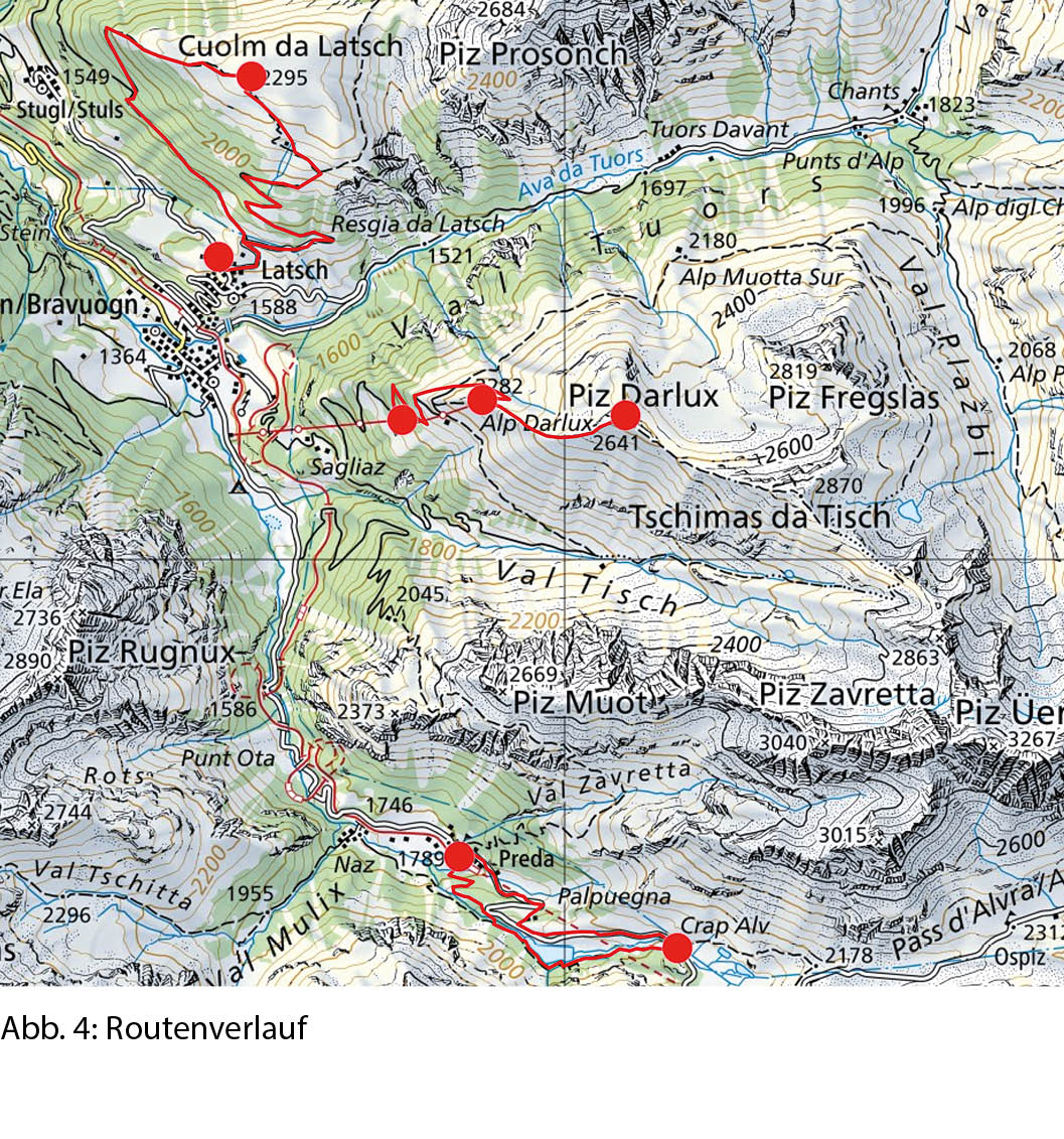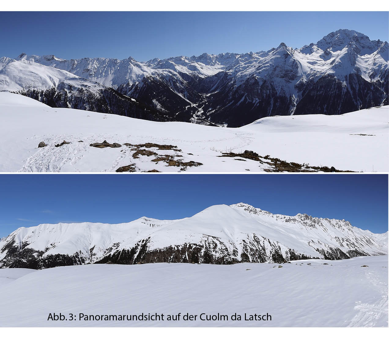 Am letzten Tag steigen wir von Latsch zur Cuolm da Latsch auf. Wir verlassen das Dorf an dessen Nordrand gegen Osten und folgen den weiten Kehren der Forststrasse durch den God dla Spena und über die Lichtung von Pro d’Men bis zur kleinen Hangschulter von Schux hinauf. Hier endet kurz vor den Felsabbrüchen der Crippels da Blanchas die Forststrasse und beginnt der stotzige Alpweg, über den wir mit einem kurzen Schlag nach Osten die Tranter Funtanas mit ihrer Wasserfassung erreichen. In nördlicher Richtung ist es nun nicht mehr weit bis zur Alphütte, ein herrlicher Ort um windgeschützt zu rasten. Während uns im Aufstieg ein grosses Rudel Gämsen ausweicht, kreist auf auf der Alp die längste Zeit ein Adlerpaar über uns. Über deutlich flachere Hänge gewinnen wir schliesslich die Cuolm da Latsch, wo sich der atemberaubende Rundblick endgültig öffnet (Abb. 3).