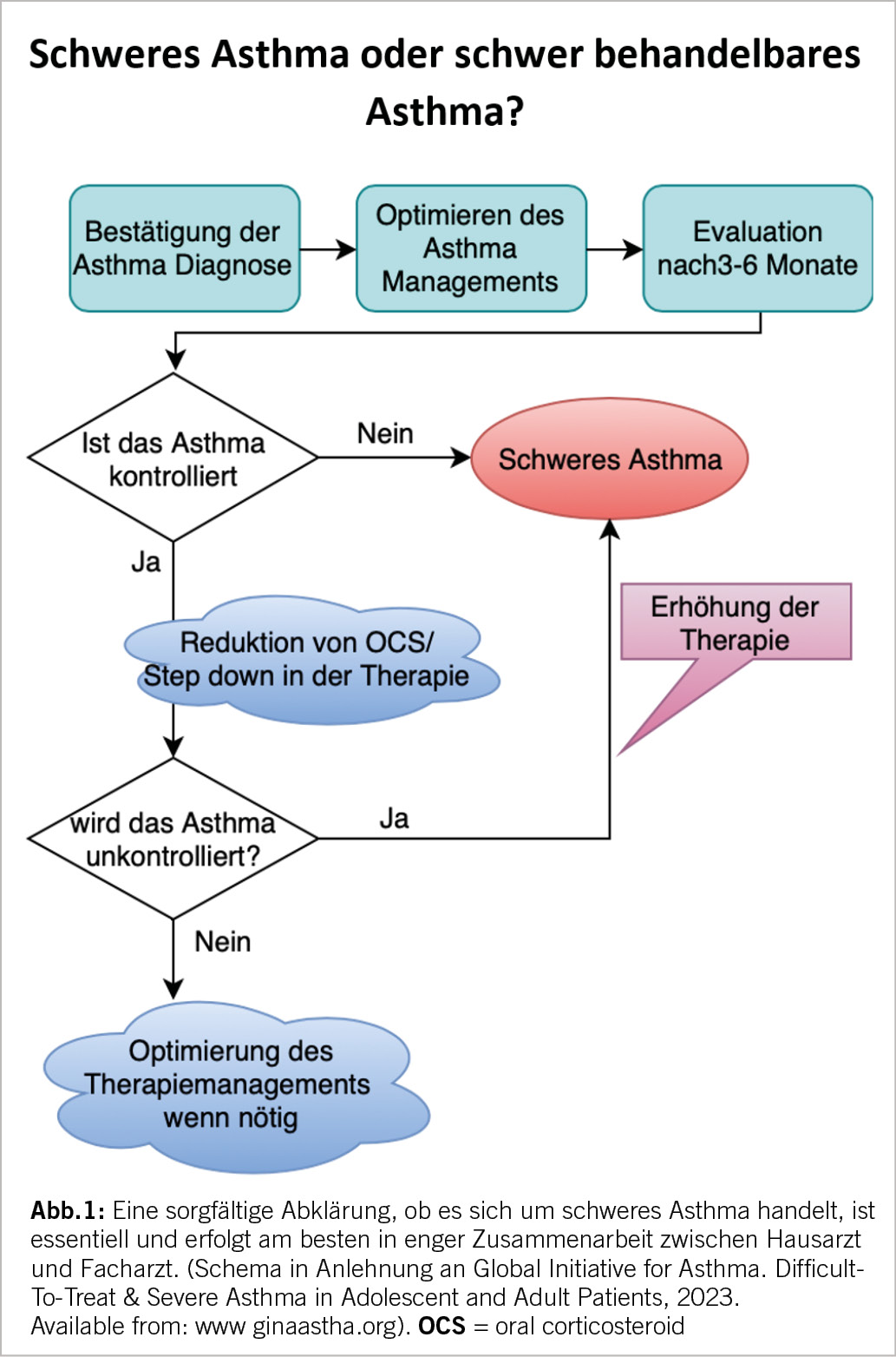 In einem ersten Schritt soll gesichert werden, dass es sich bei den vorliegenden Symptomen um Asthma handelt und nicht durch andere Erkrankungen ausgelöst ist (z.B. COPD, Reflux, Rhinosinusitis, obstruktive Schlafapnoe, etc). In der Diagnostik ist es essenziell auch nach Faktoren zu suchen, welche die Symptomatik negativ beeinflussen (z.B. Inhalationstechnik, Adhärenz, eingenommene Medikation, etc.). Als dritter Schritt soll das Therapiemanagement optimiert werden (Therapieoptimierung, nicht-pharmakologische Interventionen und die Behandlung von modifizierbaren Faktoren). Wenn die Asthmasituation, auch nach drei bis sechs Monaten und trotz optimierter Therapie und Überprüfung beeinflussender Faktoren, weiterhin unkontrollierbar ist, kann davon ausgegangen werden, dass es sich bei der vorliegenden Situation um schweres, unkontrolliertes Asthma handelt (Abb. 1) (13).