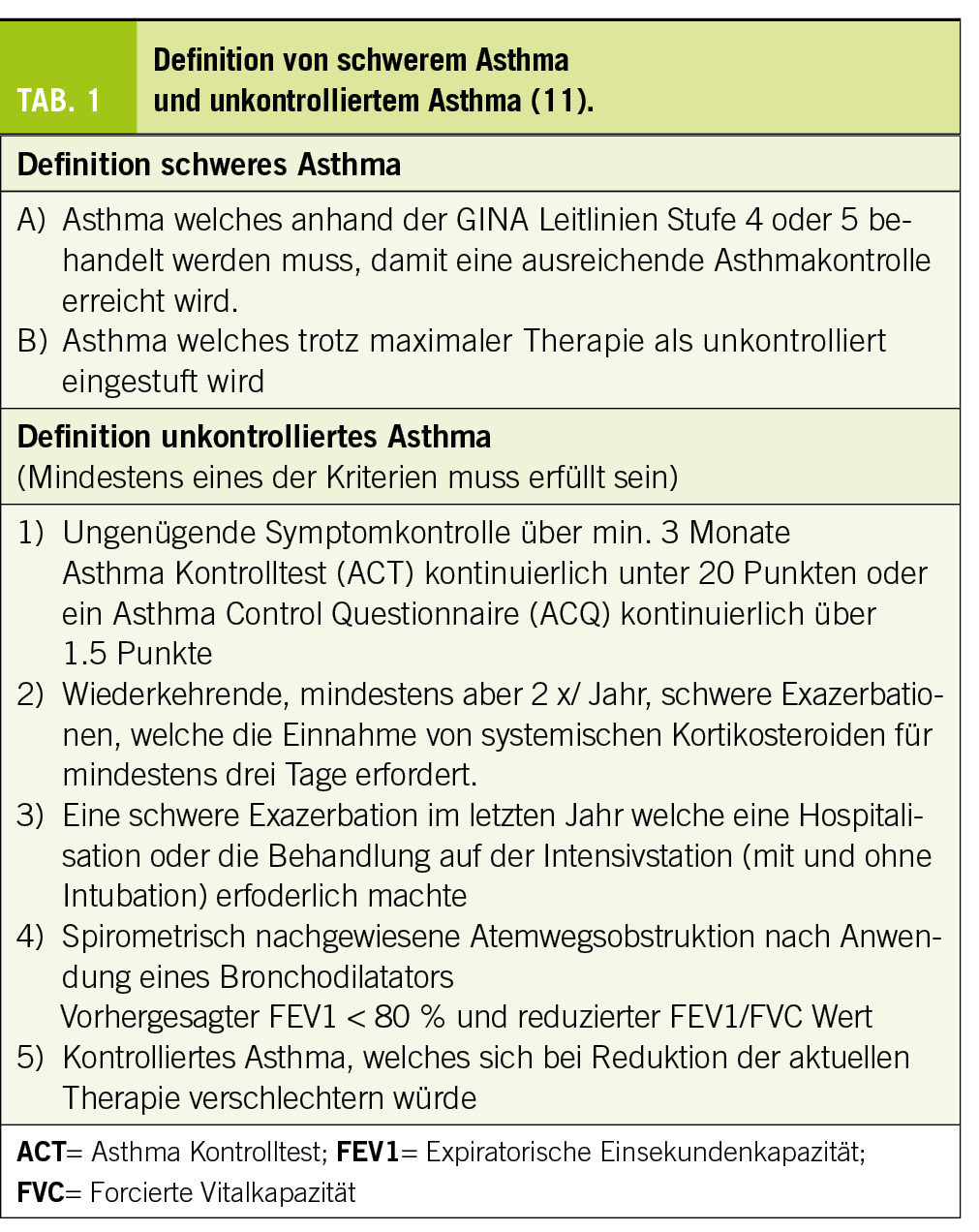 2014 wurde eine neue, gemeinsame Leitlinie der European Respiratory Society und der American Thoracic Society (ERS/ATS) zur Definition und Behandlung von schwerem Asthma veröffentlicht (11). Asthma gilt als schwer, wenn es A) eine Behandlung gemäss GINA (Global Initiative for Asthma) Behandlungsstufe 4 oder 5 (Abb. 2) erfordert oder B) trotz Behandlung auf GINA Stufe 4 oder 5 eine unzureichende Asthmakontrolle erreicht wird (Tab. 1). Die Kriterien, wann Asthma als unkontrolliert definiert wird ist ebenfalls in Tabelle 1 zu entnehmen. Bevor aber die Diagnose schweres Asthma gestellt werden kann, muss ausgeschlossen werden, dass es sich bei der vorliegenden Patientensituation nicht um sogenanntes «schwer behandelbares Asthma» (difficult to treat) handelt (13) (Abb. 1).