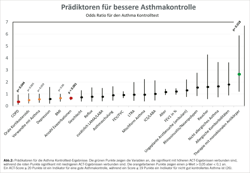 In einer ersten Analyse wurden die Daten von 278 Patienten und Patientinnen mit schwerem Asthma analysiert, um diese zu charakterisieren. Zudem wurden die eingeschlossenen Patienten und Patientinnen anhand ihres Asthmakontrolltests in die Gruppen kontrolliertes (ACT ≥20 Punkte) und unkontrolliertes (ACT ≤ 19 Punkte) Asthma eingeteilt, um herauszufinden, wie sich die Gruppen unterscheiden und welche Variablen mit der Asthmakontrolle assoziiert sind. In der analysierten Patientengruppe gibt es einige Variablen, auf welchen sich die Betroffenen mit guter und schlechter Asthmakontrolle statistisch signifikant unterscheiden (26). So sind Personen mit unkontrolliertem Asthma übergewichtiger, haben einen tieferen FEV 1 (forcierte exspiratorische Volumen in einer Sekunde) Wert, erleben mehr Exazerbationen und Krankheitstage bei der Arbeit. In Bezug auf die Komorbiditäten haben wir beobachtet, dass die schlecht kontrollierten Asthmatiker und Asthmatikerinnen weniger Sinus und/oder Nasenpolypen Operationen hatten, wobei sich die Häufigkeit von chronischer Sinusitis und/oder Nasen-Polypen nicht unterscheiden. Weiter haben wir beobachtet, dass Betroffene mit unkontrolliertem Asthma häufiger an COPD, Depressionen und induzierbarer laryngealer Obs-truktion leiden (26). Neben der deskriptiven Beschreibung unserer Population, wollten wir auch wissen, ob die Faktoren auch in einem Vorhersage-Modell stabil sind und welche die Wahrscheinlichkeit für gute respektive schlechte Asthmakontrolle erhöhen. Das Vorliegen von COPD und je grösser die Anzahl Exazerbationen, reduziert die Wahrscheinlichkeit für eine gute Asthmakontrolle (Odds Ratio < 1), wohingegen die Therapie mit monoklonalen Antikörpern die Wahrscheinlichkeit erhöht, dass die Asthmakontrolle gut ist (Odds Ratio >1) (Abb. 2) (26).