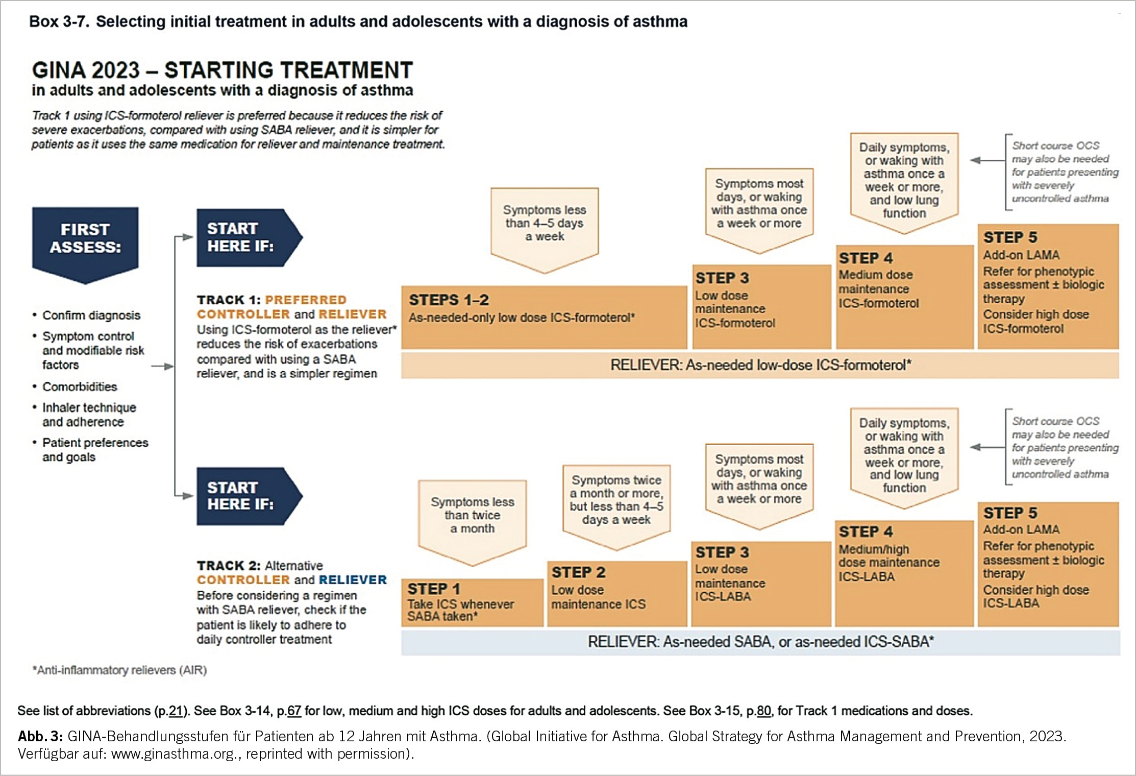 ◆ Die Behandlung von schwerem Asthma sollte nach den aktuellen GINA Guidelines erfolgen, sollte sich aber nicht nur auf die medikamentöse Therapie beschränken, sondern auch Patientenedukation und präventive Massnahmen beinhalten.