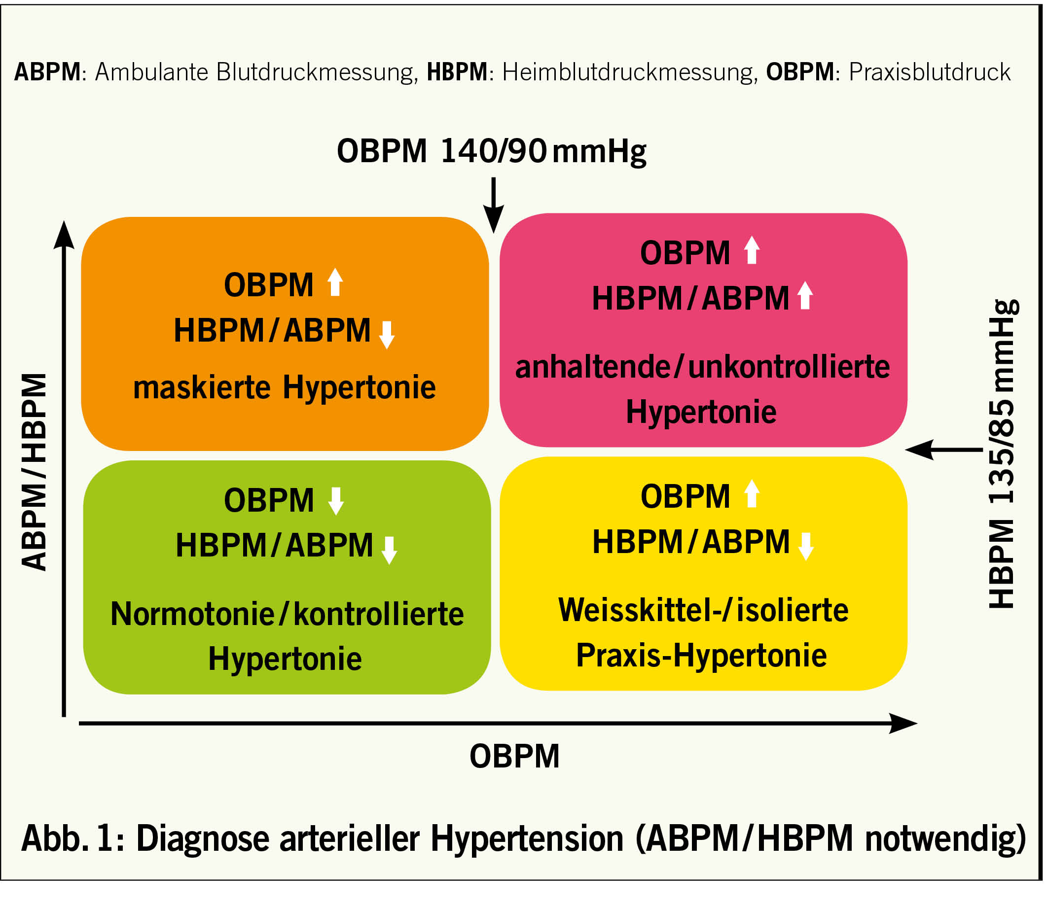 - Die Diagnose kann auf der Praxismessung und/oder der ambulanten oder der Heimblutdruckmessung basieren.