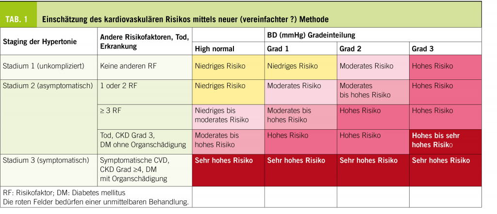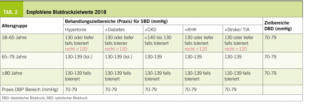 Die «neuen» europäischen Guidelines empfehlen als optimalen Blutdruck < 120 und < 80 mmHg, ein normaler Blutdruck beträgt 120-129 und/oder 80-84 mmHg und hochnormal ist 130-139 und/oder 85-89 mmHg. Grad 1 Hypertonie 140-159 und/oder 90-99 mmHg, Grad 2 160-179 und/oder 100-109 mmHg, Grad 3 ≥ 180 und/oder ≥ 110 mmHg. Isolierte systolische Hypertonie ≥ 140 und < 90 mmHg.
