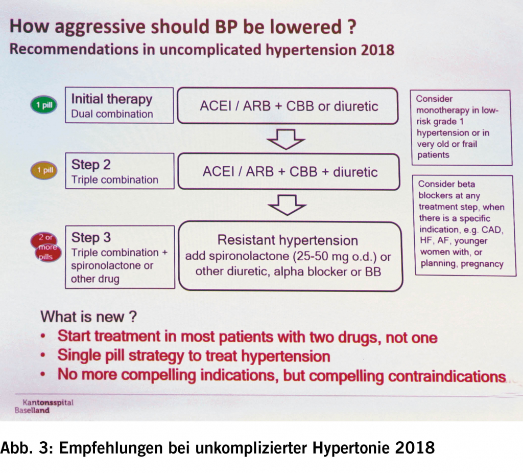 Die Blutdruckkontrollraten bleiben mit weniger als 50% der behandelten Patienten typischerweise schlecht. Die Blutdruckkontrolle wird mit den neuen Zielwerten noch anspruchsvoller sein. Die meisten Patienten benötigen eine Kombinationstherapie, die Monotherapie ist gewöhnlich zu wenig wirksam. Initiale Monotherapie und Stufentherapiekonzept lassen zu viele Patienten auf der Monotherapie. Die Multipillentherapie geht mit schlechter Compliance einher. Die duale Therapiekombination erlaubt eine schnelle, effiziente, gut erträgliche und konsistentere und effektivere Therapie. Die Einzelpillenkombinationstherapie erlaubt eine bessere Therapieadhärenz – die Patienten ziehen es vor, eine einzelne Pille zu nehmen (Single Pill Kombinationen sind als Dual- oder Tripletherapie erhältlich).