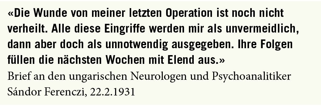 1917 entdeckte der 61-jährige Freud eine schmerzhafte Schwellung am Gaumen, die aber bald wieder verschwand. Mitte Februar 1923 meinte er, eine «leukoplastische Geschwulst» an seinem Kiefer und Gaumen festgestellt zu haben. In den folgenden 16 Jahren unterzog sich Freud 32 Operationen. Der Onkologe Professor Thomas Cerny beschreibt im nachfolgenden Beitrag Freuds Krankengeschichte aus heutiger Sicht.