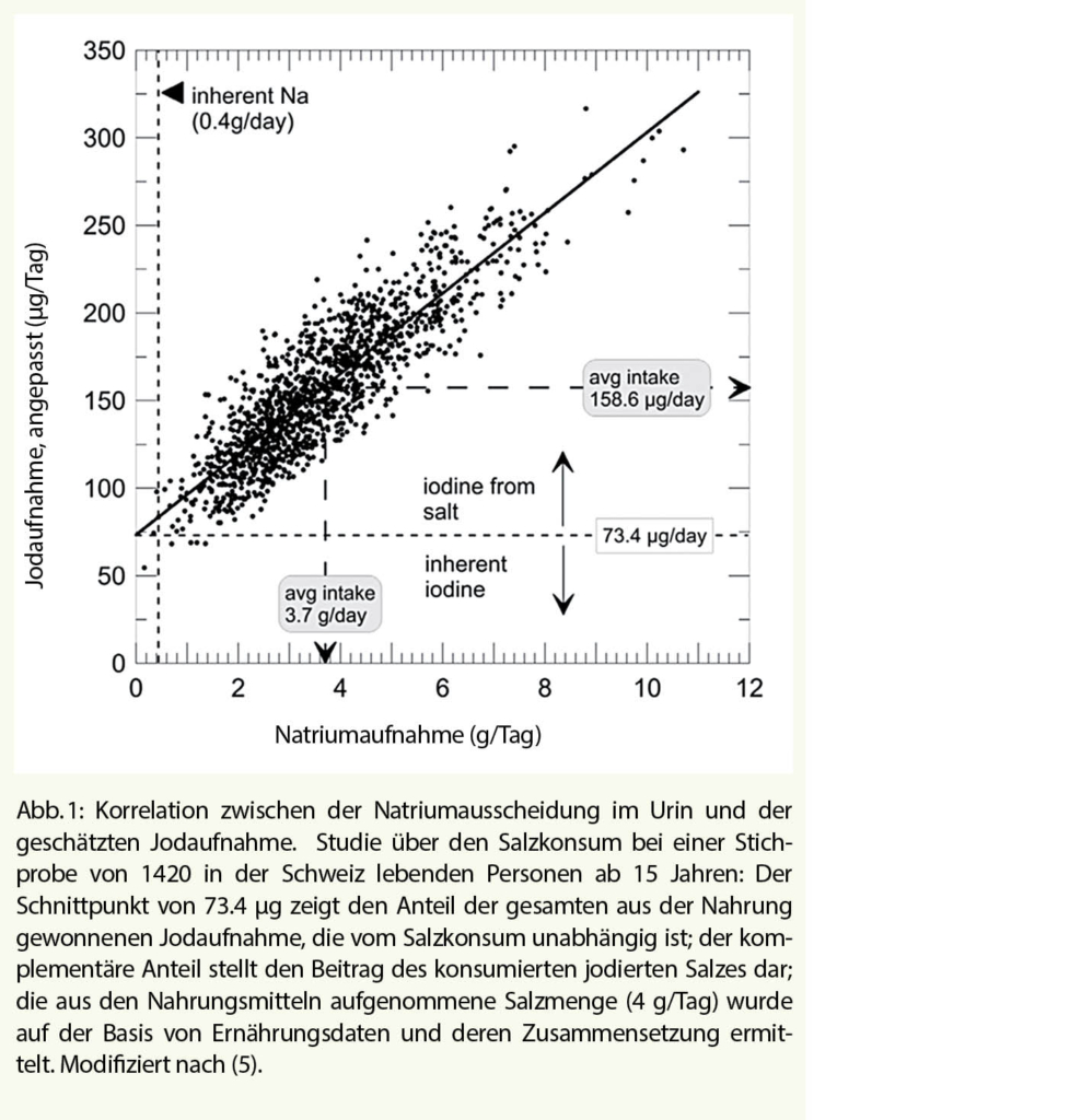 In der Schweiz wird im Rahmen der Prävention von Jodmangel und dessen klinischen Folgen dem Kochsalz Jod zugesetzt. Die Jodaufnahme der Bevölkerung steht daher in engem Zusammenhang mit dem Salzkonsum. Jüngste Daten haben gezeigt, dass bei rund 14% der Schweizer Frauen ein Jodmangel besteht. Diese Situation könnte sich im Falle einer salzarmen Ernährung (<5 g NaCl/Tag) potenziell verschlechtern. Junge Frauen im gebärfähigen Alter und ihre Kinder sind besonders gefährdet, Komplikationen durch Jodmangel zu entwickeln.