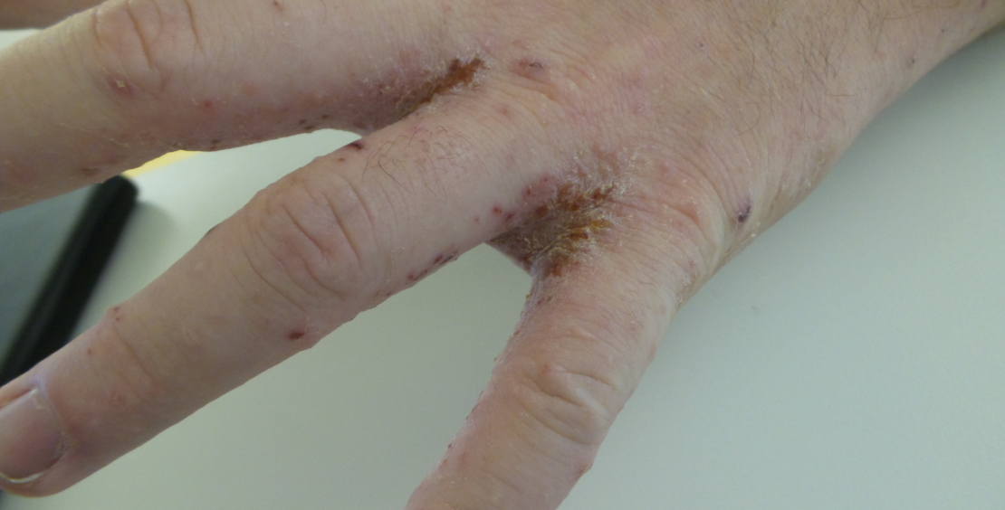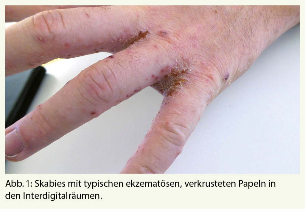 Die ansteckende Erkrankung wird gekennzeichnet durch Milbengänge, einen morphologisch heterogenen Hautausschlag und quälenden Juckreiz («scabere», lat. Kratzen). Die ersten Symptome erscheinen bei der Erstinfestation nach zwei bis fünf Wochen, bei einer Reinfestation aufgrund einer bereits bestehenden Sensibilisierung auf Milbenprodukte geschieht dies bereits innerhalb der ersten ein bis vier Tage. Prädilektionsstellen sind die Interdigitalfalten der Hände und Füsse, Ellenbogenstreckseiten, vordere Axillarfalten, Brustwarzenhof, Nabelregion, Gürtellinie, Gesäss, Analfalte, Perianalregion, Leisten, Knöchelregion, die medialen Fussränder und beim Mann insbesondere der Penisschaft (längliche Papeln in dieser Lokalisation sind nahezu beweisend für eine Skabies) (1). Die Primäreffloreszenzen sind kommaartige, oft unregelmässig gewundene, wenige Millimeter bis ein Zentimeter lange Milbengänge, an deren Ende sich manchmal ein kleines Bläschen ausbildet (3). Im Sinne einer zellvermittelten Immunantwort vom verzögerten Typ gegen den Kot der Milben kommt es zu einer Ekzemreaktion mit disseminierten erythematösen und teilweise krustösen Papeln, Bläschen und Papulovesikeln (Abb. 1) (4, 5). Charakteristisch ist eine Zunahme des Pruritus in der Nacht, wahrscheinlich aufgrund einer Senkung der Juckreizschwelle. Das klinische Bild im Säuglings- und Kleinkindalter umfasst häufig Bläschen, Blasen und Pusteln. Betroffene Kinder fallen ausserdem durch Appetitlosigkeit bis hin zu Gedeihstörungen auf (6, 7).