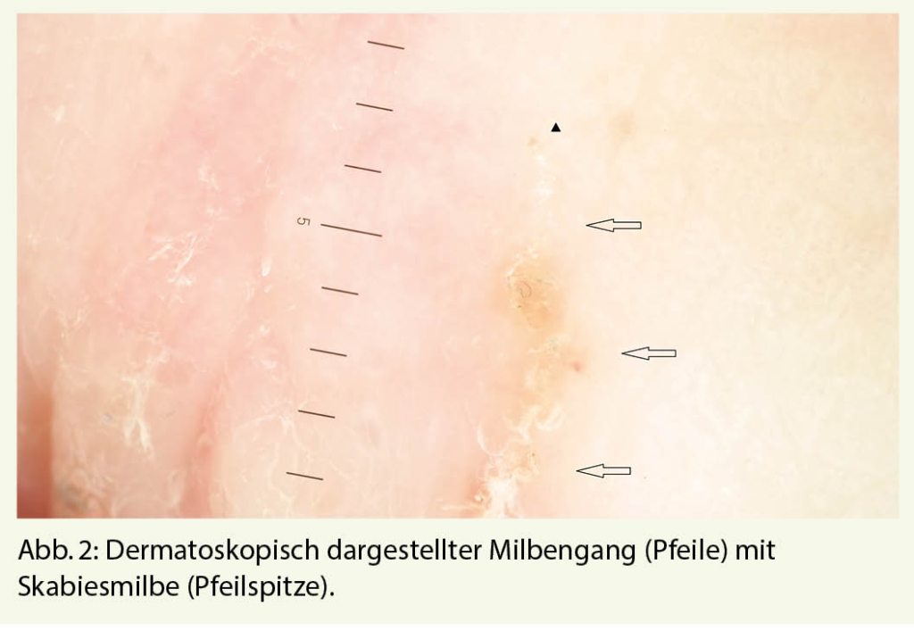 Zur Diagnosestellung einer Skabies eignet sich neben dem nativen lichtmikroskopischen Nachweis von Milben, Eiern und Skybala (Milbenkot) aus Hautgeschabsel («skin scraping») insbesondere auch die Dermatoskopie, mit der sich eine Sensitivität von bis zu 91% bei einer Spezifität von 86% erreichen lässt (Abb. 2) (10). Insbesondere bei typischer Anamnese mit mehreren betroffenen engen Kontaktpersonen und bei typischer Klinik mit gewundenen Gangstrukturen an den Prädilektionsstellen in Kombination mit Juckreiz lässt sich die Diagnose auch ohne direkten Milbennachweis stellen (11).