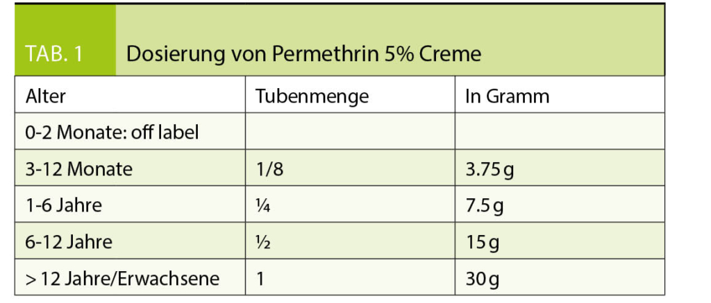 • Medikament der ersten Wahl ist Permethrin 5% Creme, zweimalig anzuwenden