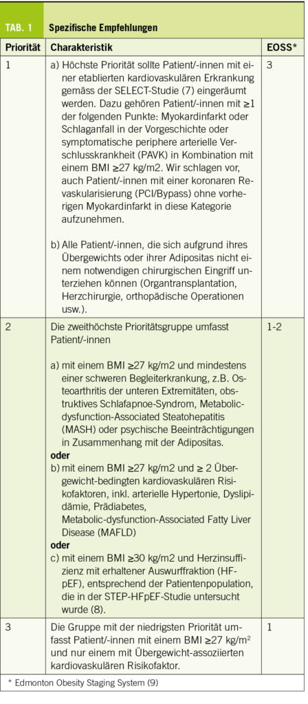 Die derzeitige begrenzte Verfügbarkeit des GLP-1-Rezeptor-Agonisten (GLP-1 RA) Wegovy® (2.4 mg Semaglutid) erfordert eine Priorisierung, bezüglich welche Patientengruppe als erste, zweite usw. behandelt werden sollte. Um die Ärztinnen und Ärzte dabei zu unterstützen, hierbei sinnvolle und (so weit wie möglich) evidenzbasierte Entscheidungen zu treffen, geben wir die folgenden Empfehlungen für den Priorisierungsprozess.