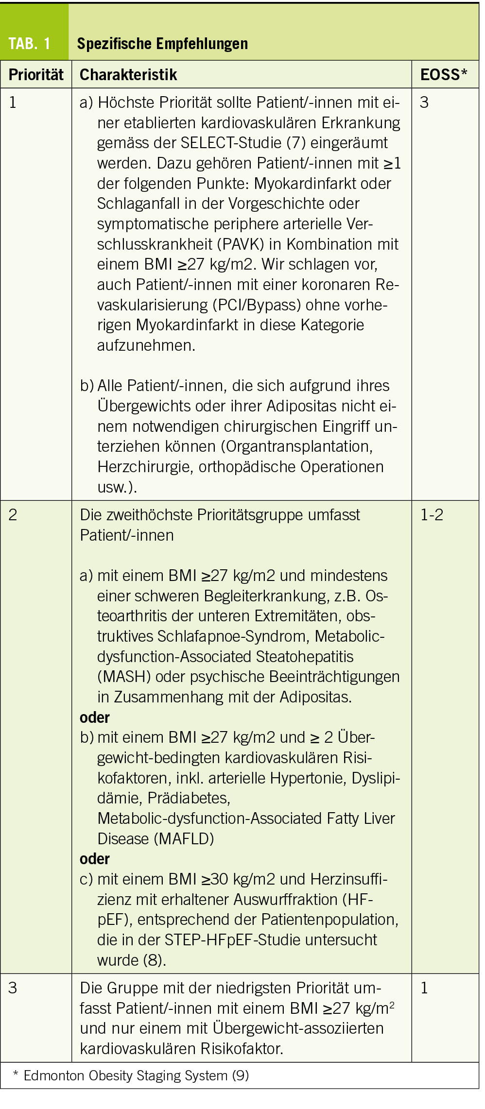 6. Die von der Swissmedic definierten Indikationskriterien für das Körpergewichtsmanagement-Medikament Wegovy® sollten prinzipiell eingehalten werden. Die eingeschränkte Verfügbarkeit von 2.4 mg Semaglutid (Wegovy®) macht jedoch eine Priorisierung der Behandlung innerhalb dieser Patientengruppe notwendig. Daher empfehlen wir hier drei verschiedene Stufen von Priorisierungskategorien.