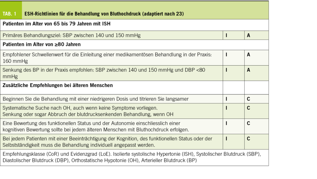 Bei 80-Jährigen sollte das Behandlungsziel 150/90 mmHg betragen, wobei der Blutdruck im Stehen und an beiden Armen gemessen werden sollte (23, 25). Wenn die medikamentöse Behandlung schlecht vertragen wird, der BD unter 130 mmHg liegt oder eine orthostatische Hypotonie vorliegt, sollte das Absetzen des Antihypertensivums stark in Betracht gezogen werden (Depressivität) (23).