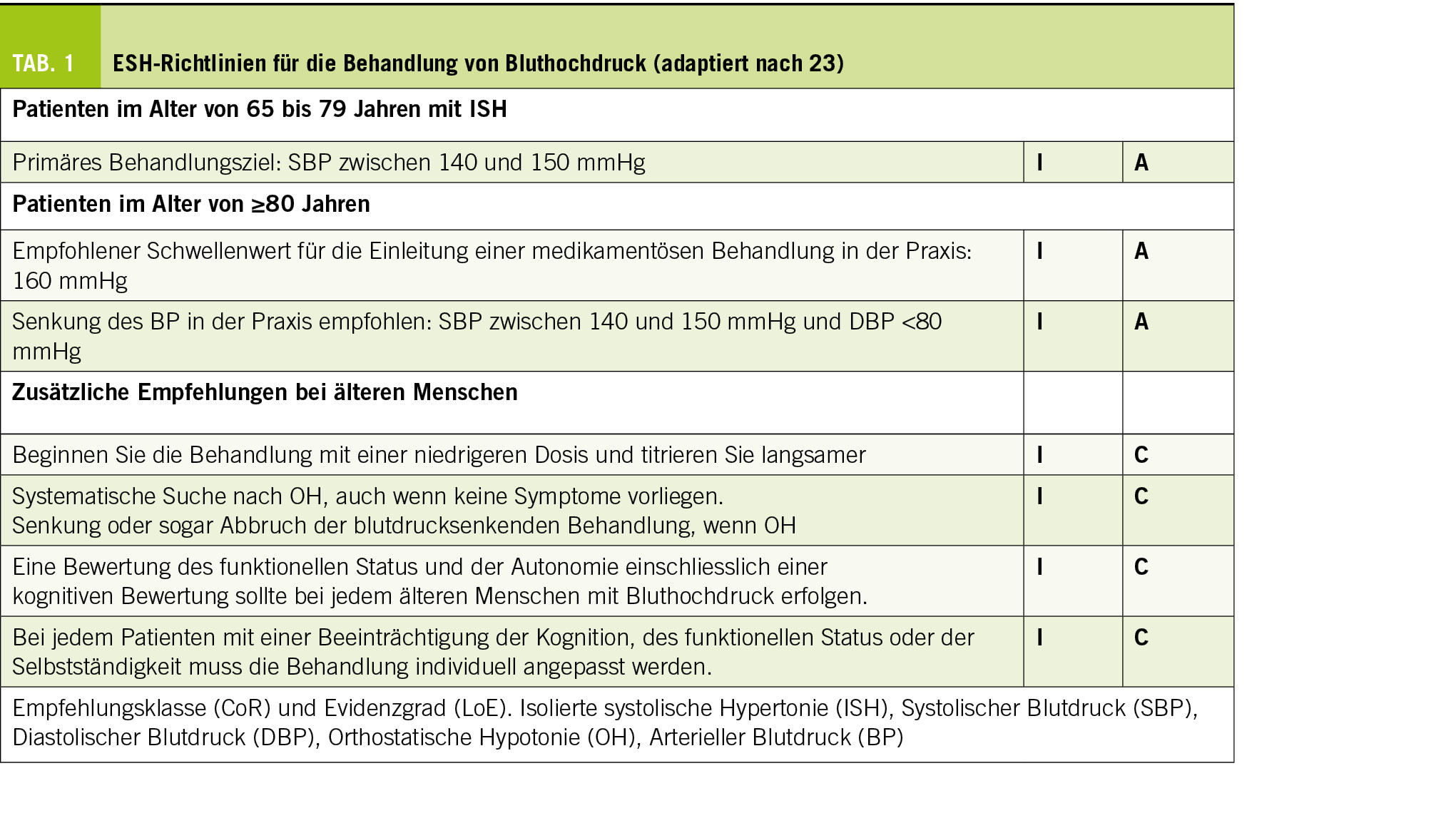 Ein BD-Zielwert von unter 130/80 mmHg, aber nicht unter 120/70 mmHg, wird für alle erwachsenen Hypertoniker empfohlen, wenn die Verträglichkeit gut ist. Die Empfehlung gilt auch für ältere Menschen ab 65 Jahren, sofern sie sich nicht in einem Pflegeheim befinden und die eingeleitete Behandlung gut vertragen wird. Bei älteren Menschen mit schweren Komorbiditäten und begrenzter Lebenserwartung (abhängige Kategorie) sollte die Wahl und Intensität der antihypertensiven Therapie unter Berücksichtigung der klinischen Beurteilung, der Nutzen-Risiko-Abwägung und der Präferenzen des Patienten erfolgen.