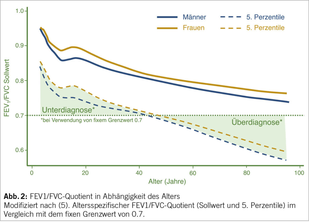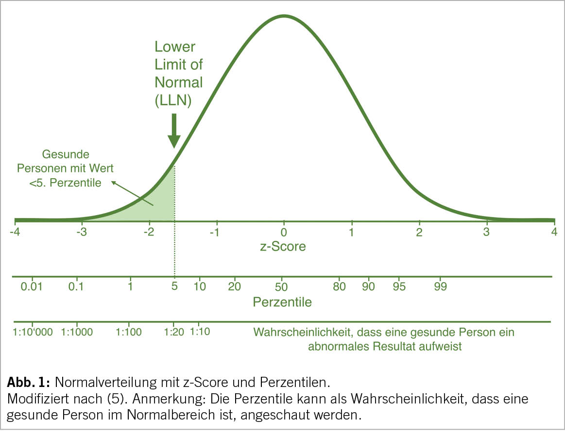 Für die Beurteilung, ob das entsprechende Lungenvolumen normal oder abnormal ist, wurde früher ein fixer Grenzwert von <80% des Sollwertes verwendet. Dieses Konzept wurde verlassen, da dies auf der Annahme beruht, dass alle Menschen eine ähnliche Lungenfunktion und eine lineare Veränderung im longitudinalen Verlauf haben sollen, was anhand von Regressionsgleichungen berechnet wurde. Dies kann zu Fehldiagnosen führen, insbesondere bei älteren Menschen oder Personen mit geringer Körpergrösse. Entsprechend den neuen Leitlinien soll die Grenze zu abnormal anhand der altersspezifischen statistischen Verteilung und der entsprechenden unteren 5. Perzentile (LLN) vorgenommen werden. Ein Wert unter der 5. Perzentile (LLN) wird als abnorm angesehen. Es ist aber festzuhalten, dass dieser Wert immer noch bei 5% der Normalbevölkerung als Normalwert gilt. Oder anders formuliert: die Chance, dass der Wert noch normal ist, beträgt 1:20 (Abb. 1).